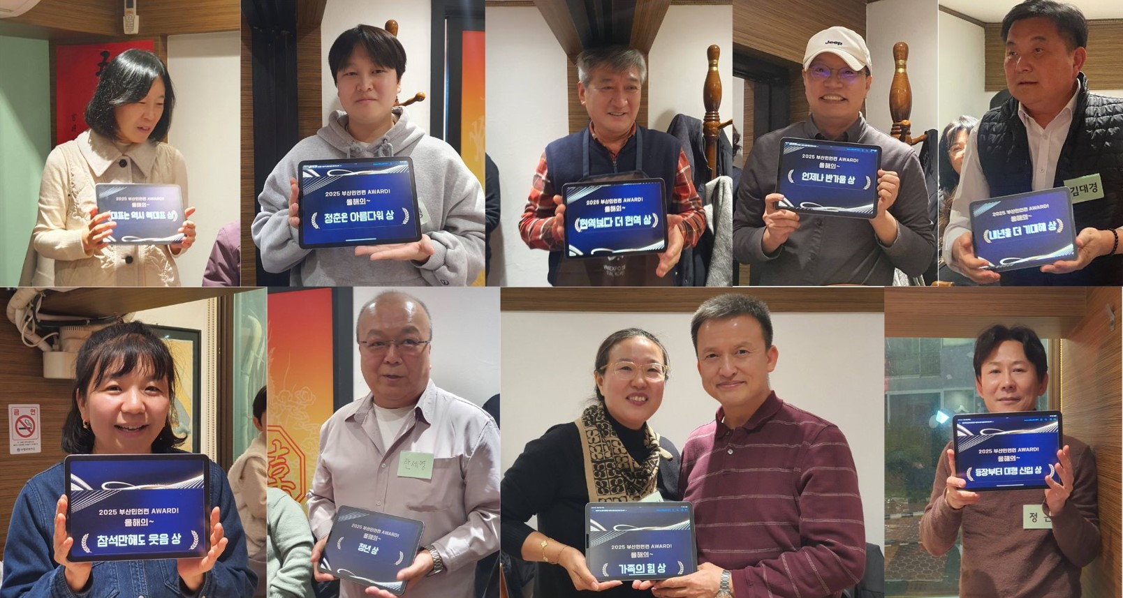 송년회에 참여한 회원들과 ‘부산민언련 어워드, 올해의~~상’ 시상도 진행했습니다. 행사마다 회원들과 나눌 수 있는 상품을 준비해주시고 하는 조영인 회원껜 ‘산타는 실존상’을, 후원주점을 힘껏 도와주신 김효담 회원께는 ‘자원봉사상’을, 그리고 올해 회원이 되신 정근 회원께는 ‘등장부터 대형신인상’을 비롯해 ‘거리의합창단’ ‘공동체미디어지키미상’ ‘가족의힘상’ ‘대표는역시복대표상’까지 올해 함께해주신 회원 한분 한분의 활동에 감사하고, 성과를 응원하는 훈훈한 시간이었습니다.