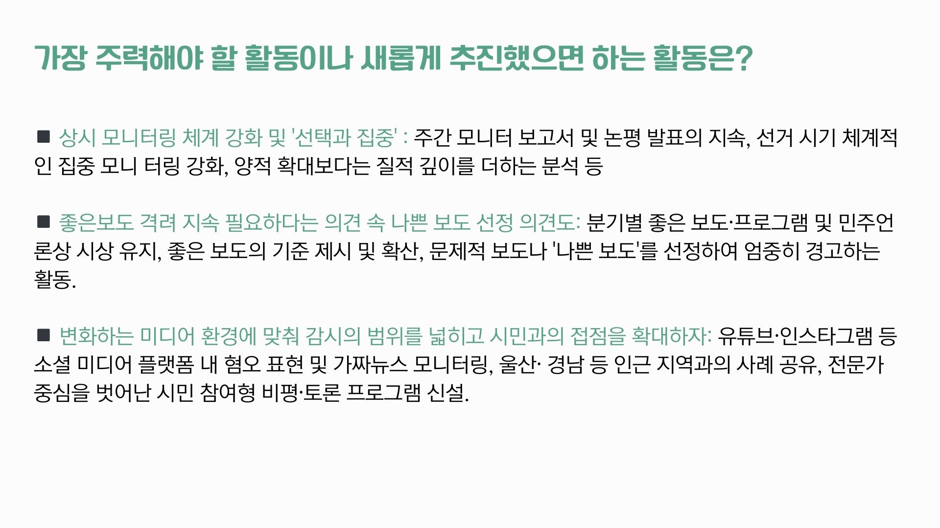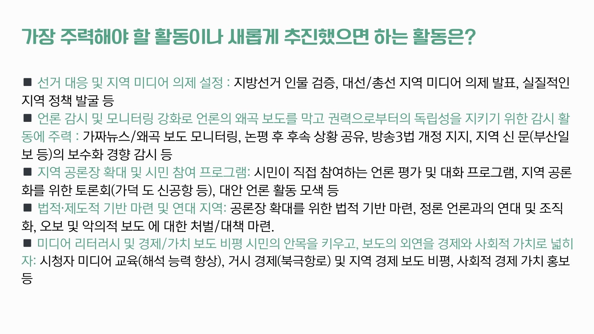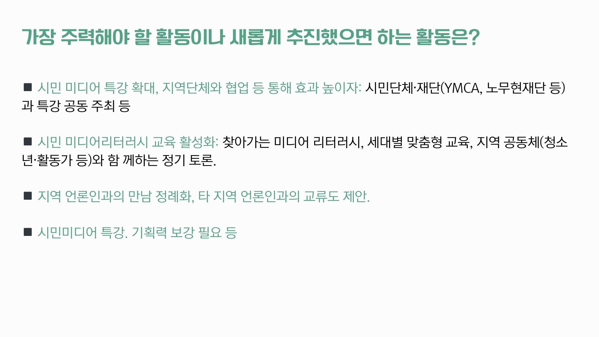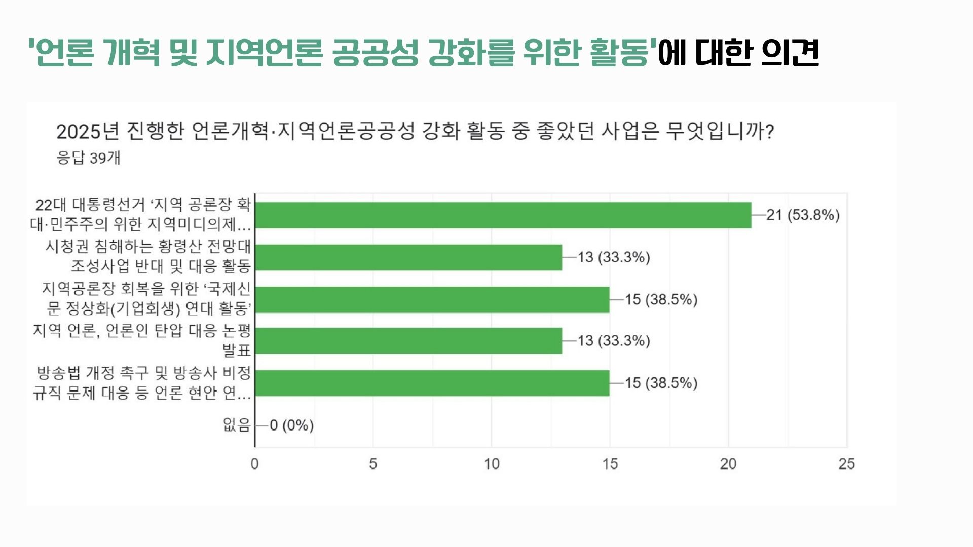 또 앞으로는 ‘지역 언론과 권력의 유착 행태에 대한 강력한 감시와 견제’, ‘지역 언론에 대한 시민의 관심과 공감 유발, 지역민 참여 확대’, ‘시민을 위한 비판적 미디어 리터러시 교육 강화’, ‘지역 중심 독립 미디어 발굴, 지원, 홍보’ 활동이 더 필요하다고 응답했습니다.