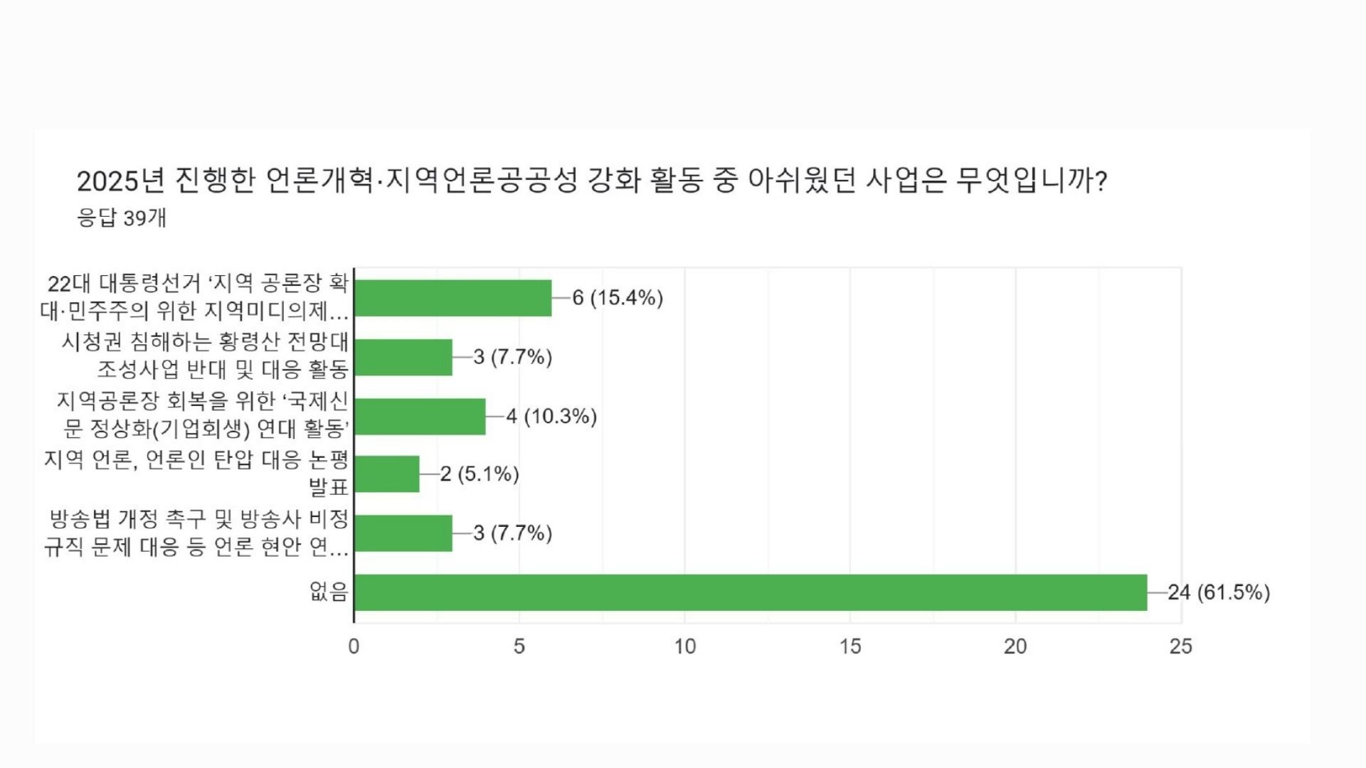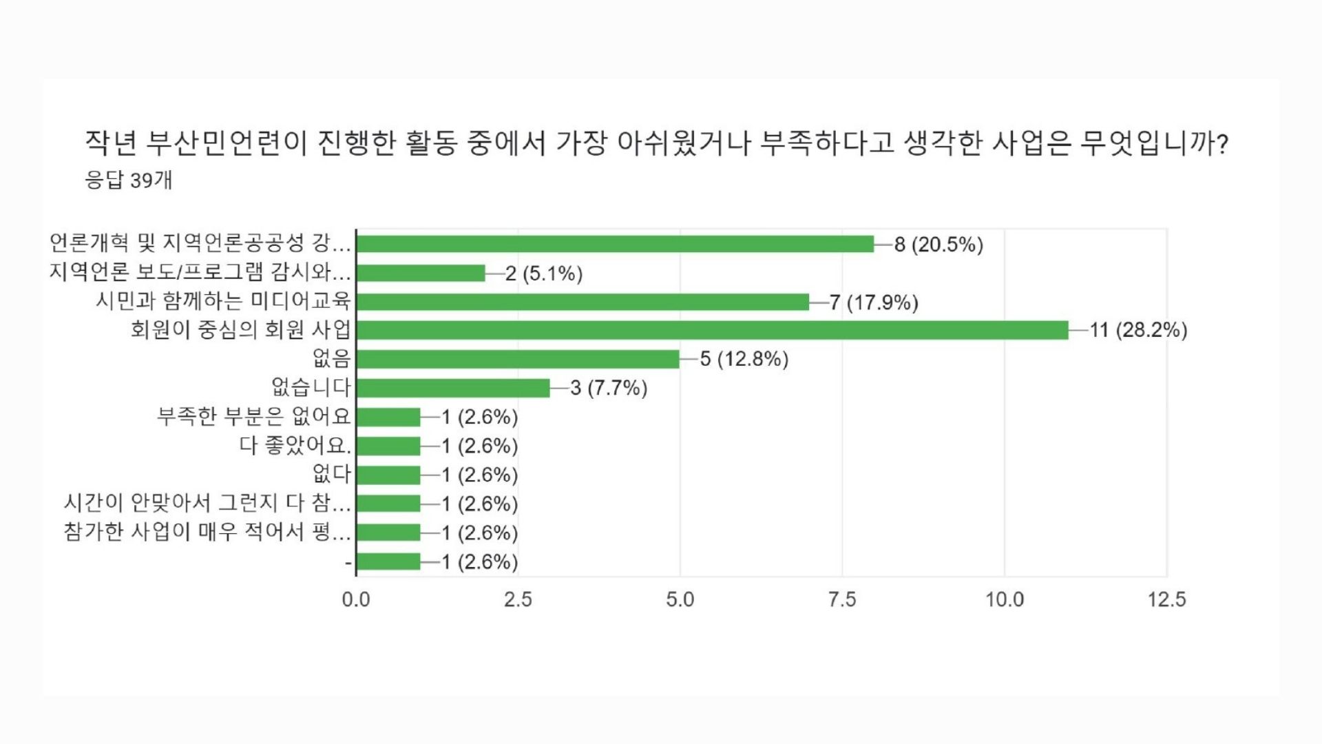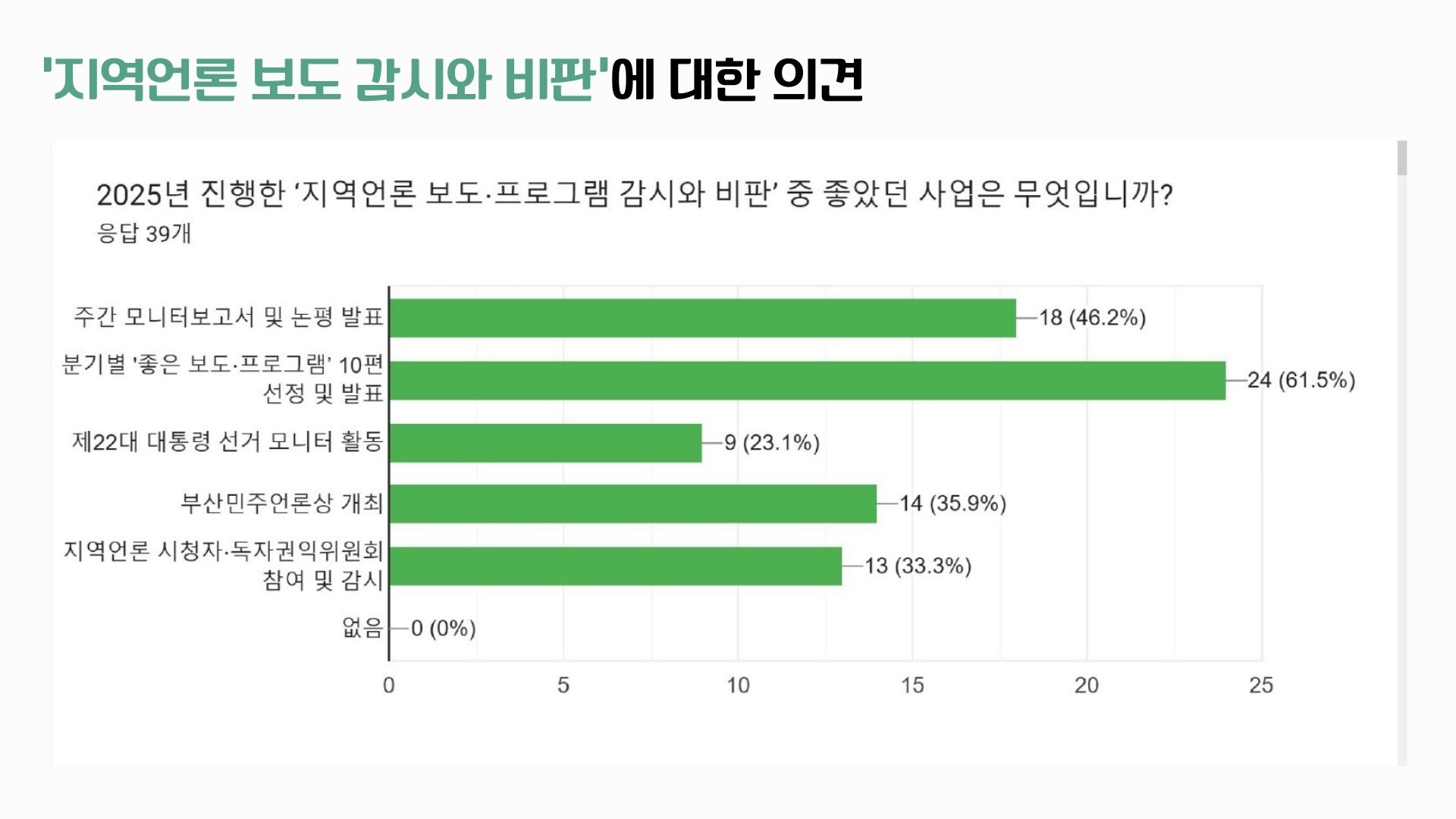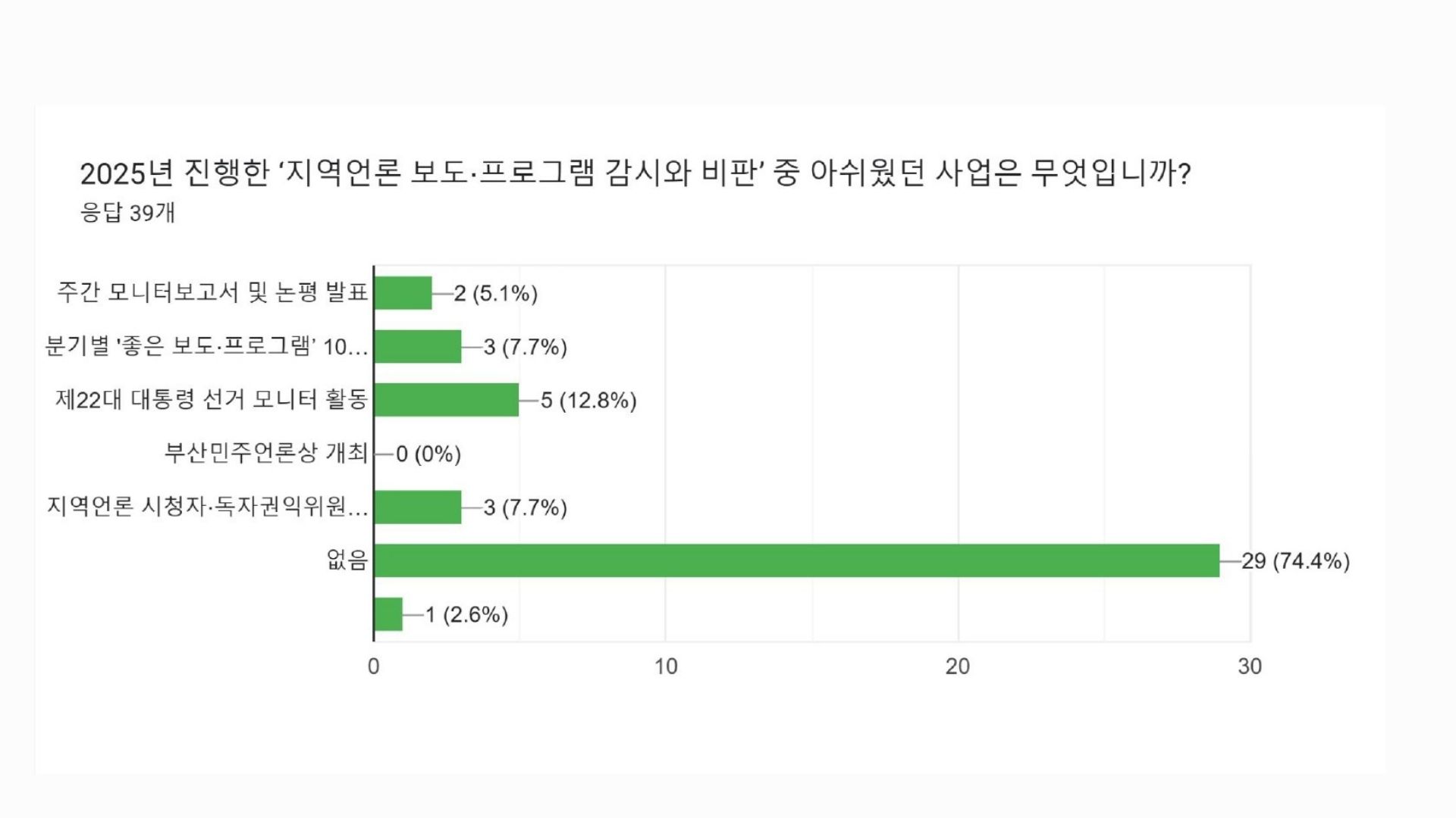 38명의 회원분들께서 사업 분야별로 좋았던 사업과 아쉬웠던 사업, 그리고 더 중점해야할 의견 등을 직접 남겨주셨습니다. 특히 회원들께서는 2025년 전체 활동 중에서 ‘지역언론 보도/프로그램 감시와 비판 활동’을 가장 좋았던 활동으로 꼽아주셨고, 이어 언론개혁 및 지역언론공공성 강화를 위한 활동’을 선택해주셨는데요, 부산민언련 본연의 언론감시, 언론개혁 활동을 중요성을 한 번더 강조해주신 것으로 보입니다. 아쉬웠던 부분은 회원 중심의 회원사업이었는데요, 회원님들이 주신 의견 모아 2026년 사업에 반영하고 추진할 계획입니다. 직접 주신 의견들은 요약해 공유드립니다.