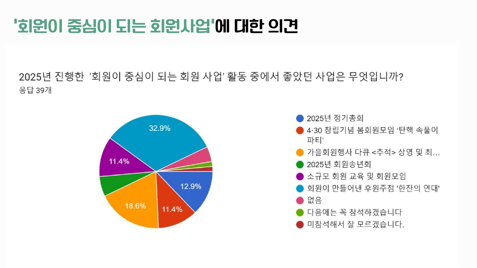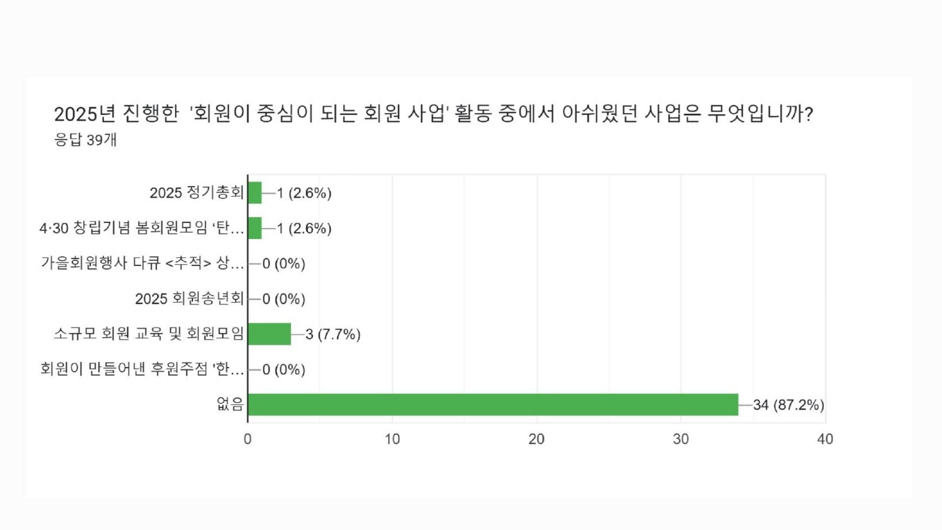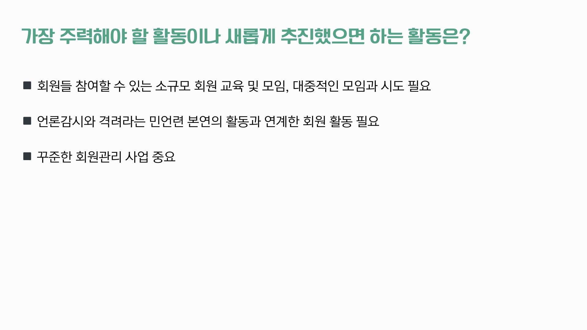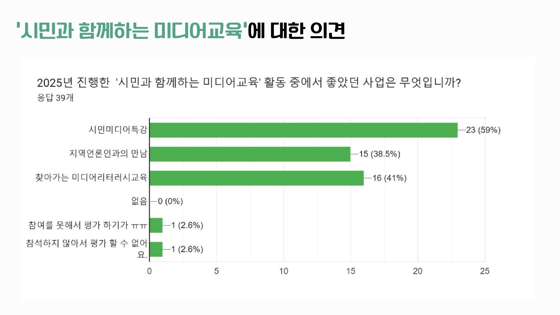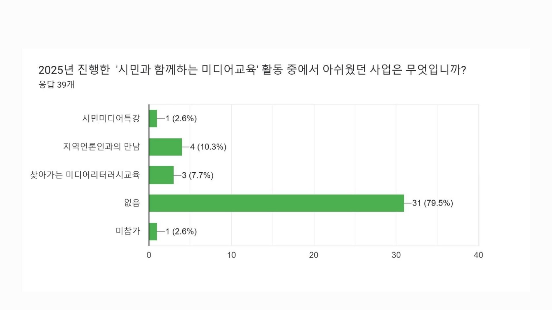 38명의 회원분들께서 사업 분야별로 좋았던 사업과 아쉬웠던 사업, 그리고 더 중점해야할 의견 등을 직접 남겨주셨습니다. 특히 회원들께서는 2025년 전체 활동 중에서 ‘지역언론 보도/프로그램 감시와 비판 활동’을 가장 좋았던 활동으로 꼽아주셨고, 이어 언론개혁 및 지역언론공공성 강화를 위한 활동’을 선택해주셨는데요, 부산민언련 본연의 언론감시, 언론개혁 활동을 중요성을 한 번더 강조해주신 것으로 보입니다. 아쉬웠던 부분은 회원 중심의 회원사업이었는데요, 회원님들이 주신 의견 모아 2026년 사업에 반영하고 추진할 계획입니다. 직접 주신 의견들은 요약해 공유드립니다.