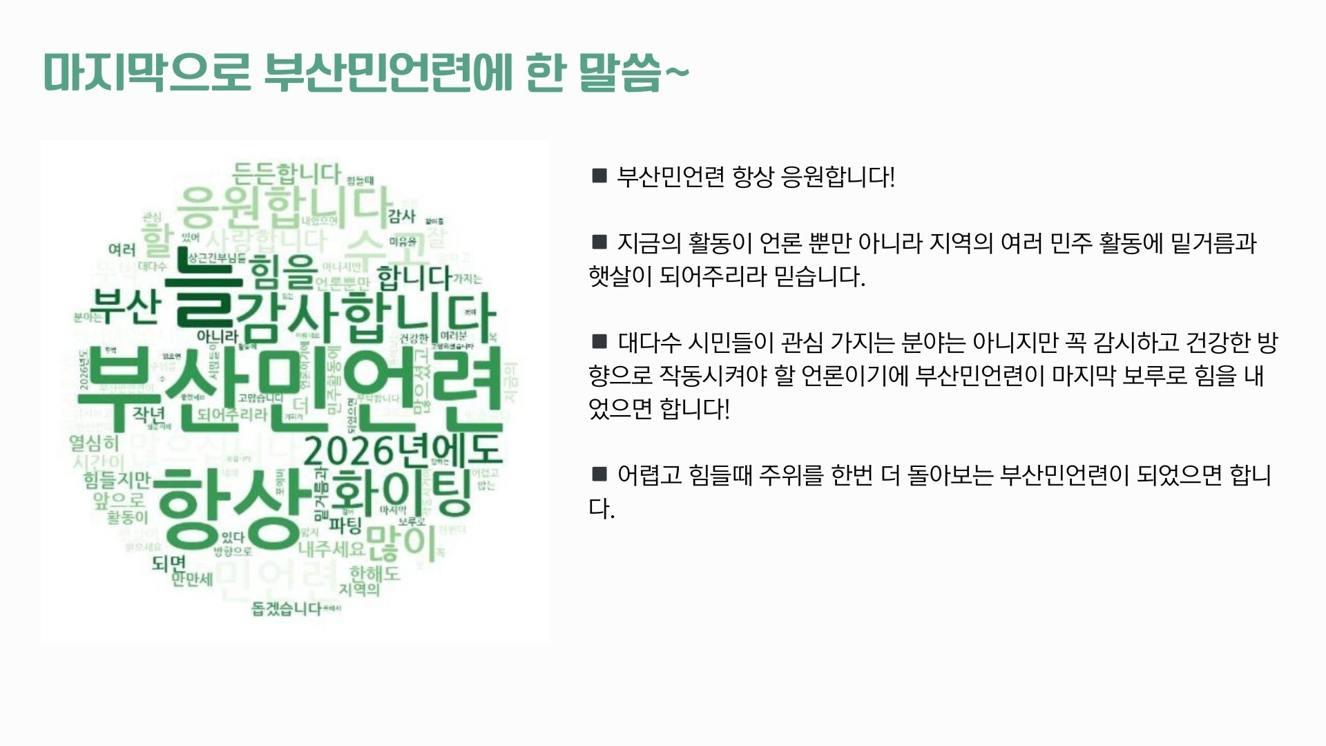 “부산민언련은 부산민주언론상을 준비하고 선정하는 과정에서 부산시민이 언론다운 언론을 얼마나 열망하고 있는지 느낄 수 있었습니다. 응모하신 개인과 단체, 본선 후보작 선정에 수고한 심사위원회, 최종 투표로 언론의 변화를 적극적으로 요구한 부산민언련 회원 모두에게 감사합니다. 이 모든 우리의 행동이 결국 언론개혁의 큰 바다로 향하는 작은 물길이라 생각하며 부산민언련도 정진하겠습니다.”