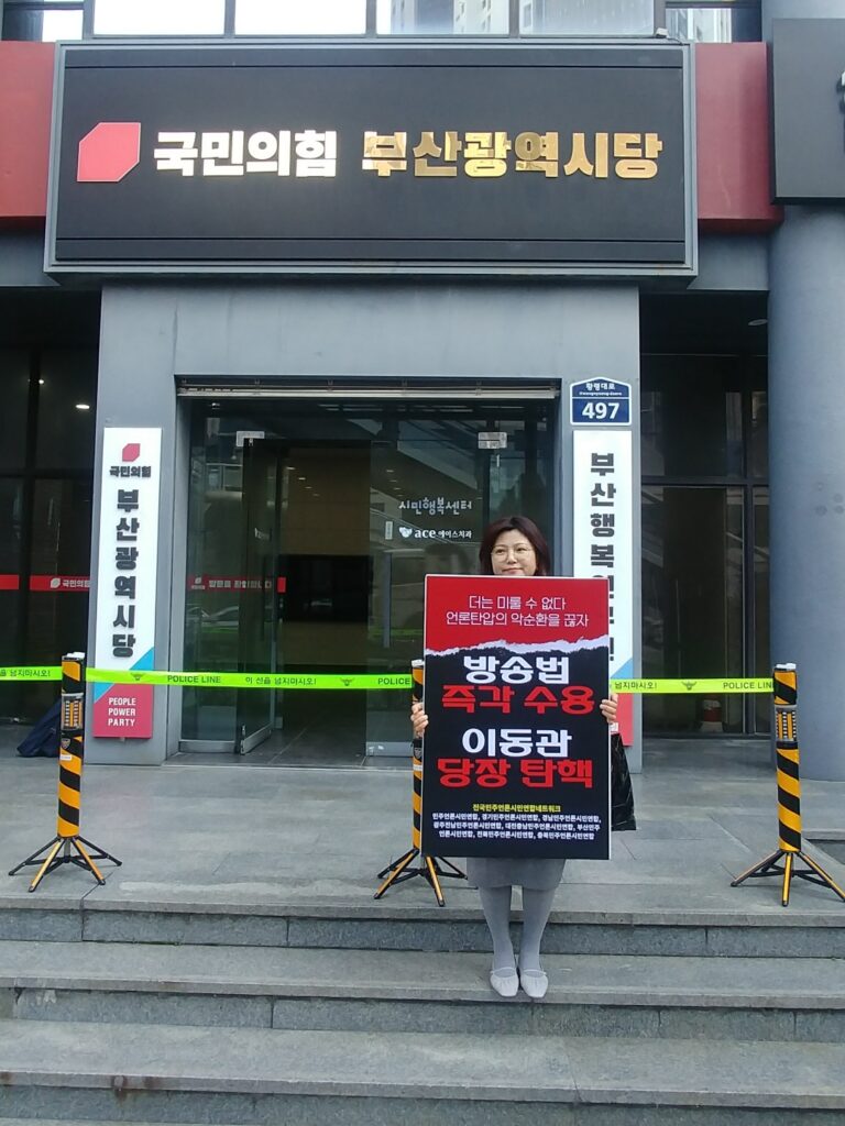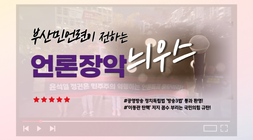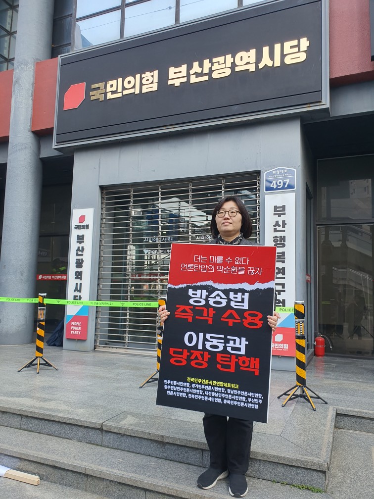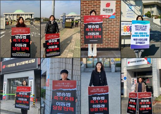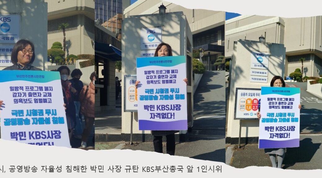 이에 전국민언련네트워크는 취임 직후 보여준 박민 사장 행보는 KBS의 진정한 주인 시청자를 무시하고, 방송의 자율성을 침해한 심각한 문제로 보고 사퇴를 촉구하는 공동 성명을 발표했습니다. 더불어 부산민언련은 이런 규탄의 입장을 담아 KBS부산총국 앞에서 1인 시위를 진행했습니다.