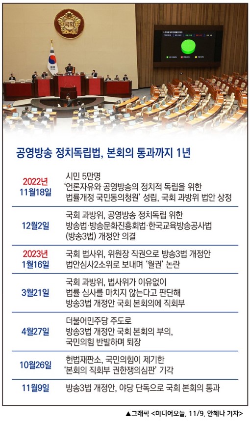 박장범 앵커로 교체된 KBS <뉴스9>는 군사독재 시절 정권 나팔수 노릇을 하던 ‘땡전뉴스’를 연상시켰다. 11월 13일 <뉴스9> 오프닝은 “기존 (KBS) 뉴스가 공영방송의 정체성을 흔들고, 정파성 논란을 일으켰다”는 주장이었다. 사장 한 명 바뀌었다고 자사 보도 평가가 이렇게 돌변할 수 있단 말인가. 이어 첫 보도로 한미동맹을 내놓더니 근로시간 개편 정책에 혼선을 가중시킨 윤석열 대통령의 발언을 마치 국민을 위해 재검토 지시를 한 듯 보도했다. 공영방송 KBS 가치는 온데간데없는 친정부적 ‘땡윤뉴스’ 개시와 다름없다. 하루 만에 공영방송이 ‘친윤방송’으로 전락되는 현실에 공영방송 시청자로서 한없이 부끄럽고, 국민으로서 더없이 치욕스럽다.