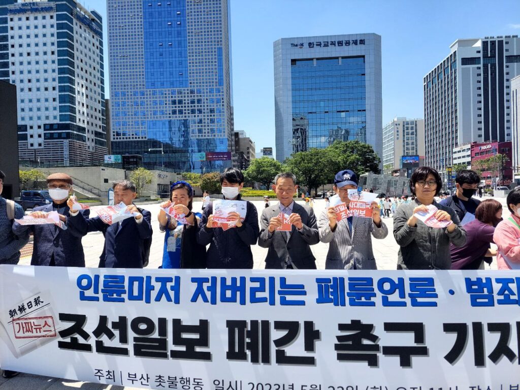 이와 관련 5월 23일 부산촛불행동은 부산역 광장에서 ‘인륜마저 저버리는 폐륜언론·범죄언론 조선일보 폐간 촉구 기자회견’을 열었습니다. 기자회견에서는 양회동 노동자의 분신 방조 의혹을 보도한 조선NS, 유서 대필 의혹을 제기한 조선일보는 언론의 자격을 상실했다며 폐간을 주장했습니다. 사무국에서도 참여하여 동료가 말렸다는 YTN기자 진술도 무시하고 유서 필체 대조도 제대로 하지 않은 채 폄훼하기 위한 기사 작성에 급급한 조선일보 보도 행태를 비판했습니다.