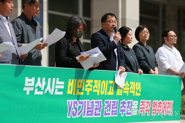 부산시민연대, 부산공공성연대, 부산여성단체연합, 부산민중연대 등 지역 시민사회단체는 5월 24일 기자회견을 열고 부산시의 ‘YS기념관 건립 추진’을 중단할 것으로 촉구했습니다.
