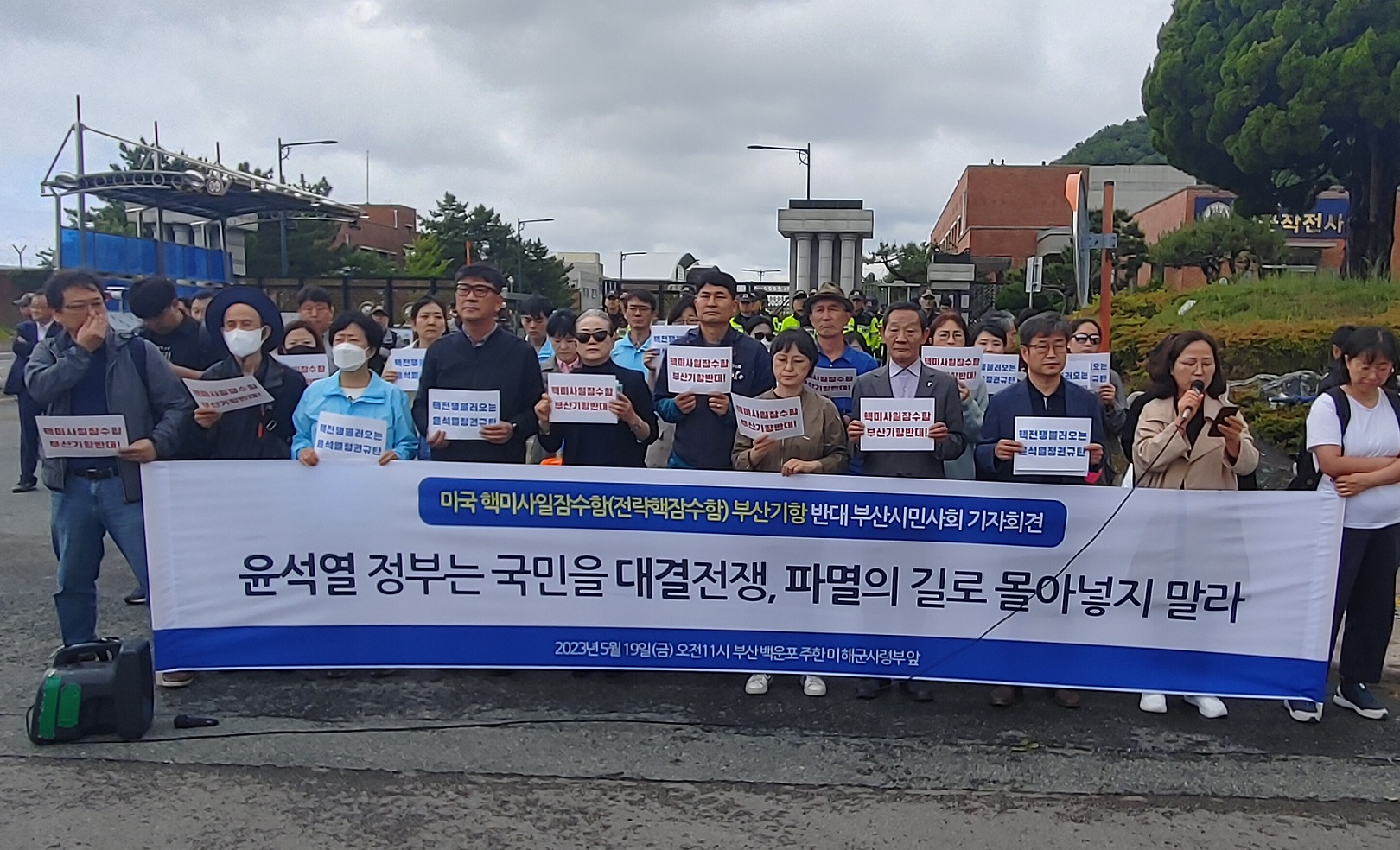 부산지역 시민사회단체는 5월 19일 부산백운포주한미국사령부 앞에서 기자회견을 열고 미국핵미사일잠수함(전략핵잠수함) 부산기항 반대 입장을 밝혔습니다. 기자회견에서는 부산에 미국 핵잠수함이 기항하는 것은 40여년만에 처음이라며 부산시민을 대결과 위험으로 몰아넣는 것이라고 주장했고 윤석열 정부에 대결 정책을 중단할 것을 촉구했습니다.