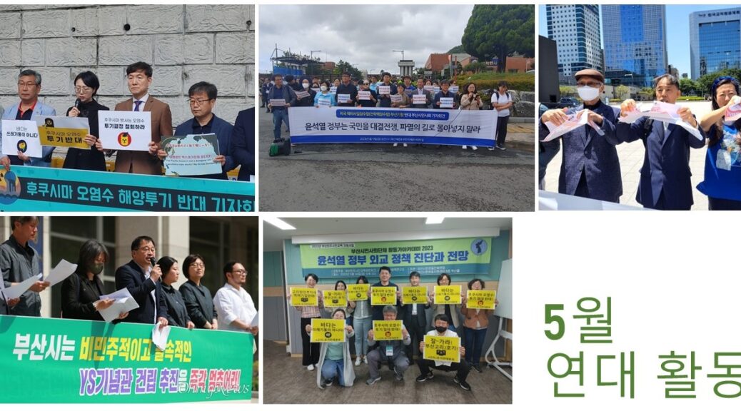 5월 우리단체는 부산시민운동연대를 비롯한 지역 시민사회와 연대하여 ‘후쿠시마 원전 오염수 방류 반대’ 활동과 건설노동자 죽음마저 폄훼한 조선일보 규탄, 부산시의 YS기념관 졸속 추진 반대, 평화정책 촉구 활동에 함께했습니다.