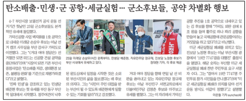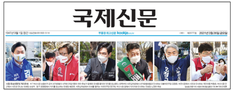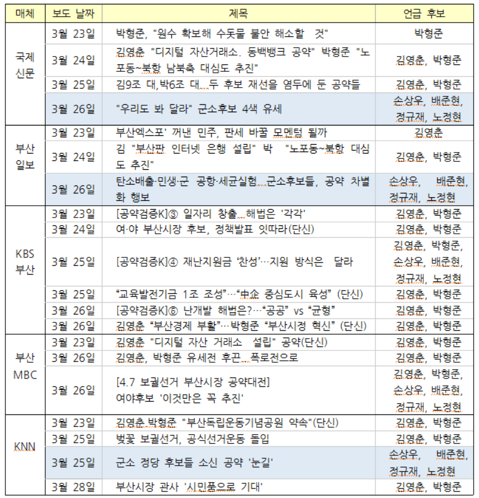 국제신문도 3월 26일자 선거보도 7건 중 단 2건이 군소후보를 다루었다. 1건은 포토뉴스로 6명 후보 사진을 게재했고, 나머지 1건 <“우리도 봐달라” 군소후보 4색 유세> 기사에서만 미래당 손상우, 민생당 배준현, 자유민주당 정규재, 진보당 노정현 후보의 공약을 소개했다. 부산일보 역시 선거보도 6건 중 단 1건 <탄소배출·민생·군 공항·세균실험…군소후보들, 공약 차별화 행보>에서만 군소정당 각 후보의 공약과 시정에 대한 철학을 담았다.