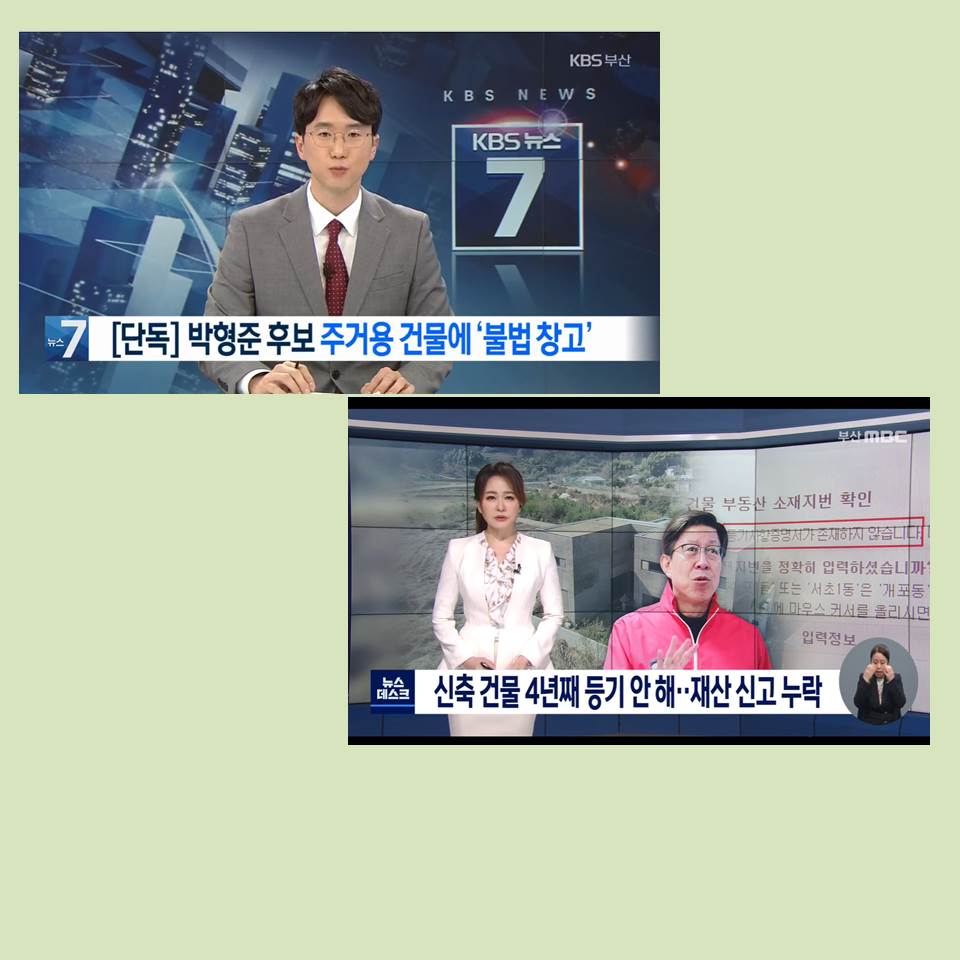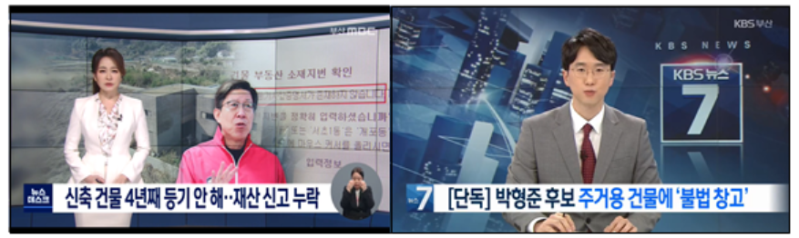 부산MBC 윤파란 기자의 <신축 건물 4년째 등기 안 해..재산 신고 누락>(3/23), <4년간 미등기 건물..이제야 재산신고>(3/24)에서 박형준 후보 배우자 명의의 ‘미등기 건축물’을 확인하여, 후보 등록 시 재산 신고에서 제외된 점을 밝혀냈다. 이에 박후보 측은 행정상의 실수였다며 재산 신고 내역을 정정했고, 부산선관위는 미등기 건물이 재산 신고에서 빠진 점이 ‘허위사실공표’에 해당하는지 조사에 들어갔다.