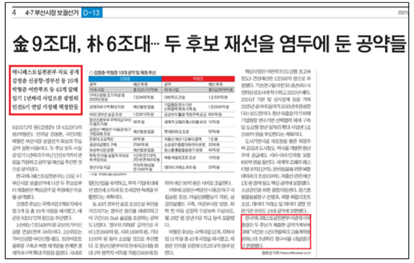 국제신문의 <김 9조대, 박 6조대…두 후보 재선을 염두에 둔 공약들>(3/25, 4면)기사는 매니페스토실천본부가 김영춘, 박형준 후보로부터 제출받은 핵심공약 및 추정예산 자료를 공개해 두 후보의 핵심 공약과 재원을 짚었다. 두 후보 모두 임기 1년짜리 사업이라기보다 민선8기 연임을 가정해 책정한 공약과 예산임을 지적하며 “시민은 1년 3개월짜리 고용계약을 원하는데 5년짜리 청구서를 내밀었다”고 꼬집었다.