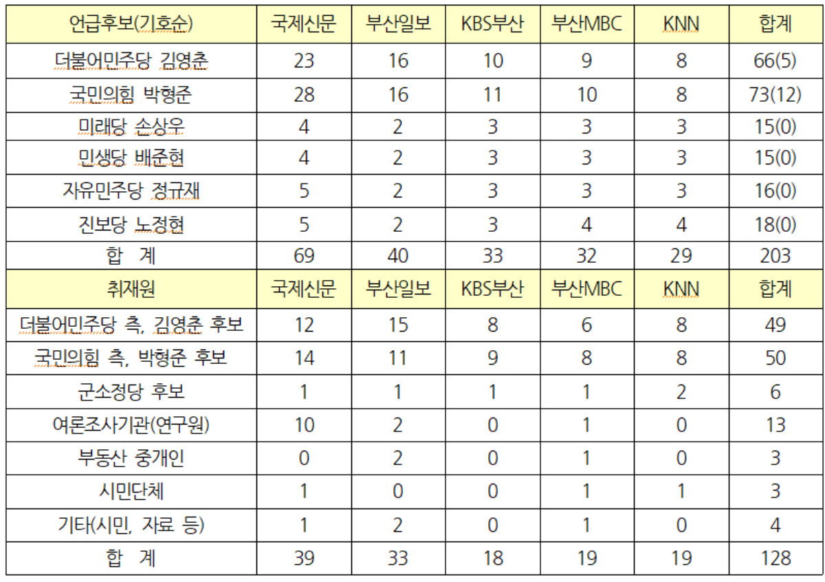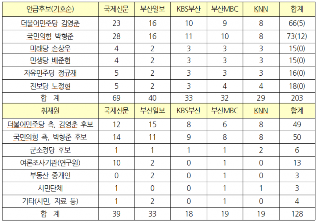 군소정당 후보에 대한 홀대는 기사에 인용된 취재원에서도 극명하게 나타났다. 더불어민주당 인사와 김영춘 후보·국민의힘 인사와 박형준 후보를 인용한 기사는 99건으로 77.3%를 차지했다. 반면 군소정당 후보가 취재원으로 인용되는 기사는 단 6건에 불과했다. 이 중 1건은 KNN <박형준 후보 건물등기 누락, 여.야 공방>(3/24) 기사에서 진보당 노정현 후보가 박형준 후보의 미등기 건물 재산 신고 누락과 관련하여 부산선관위에 조사를 요청하는 것으로 언급되었다. 또 KBS부산 <재난지원금 ‘찬성’…지원 방식은 달라>(3/25), 부산MBC <여야 후보 ‘이것만은 꼭 추진’>(3/26) 보도에서는 등록한 6명 후보 모두를 소개하거나 부산 이슈에 대한 답변을 전하는 내용이어서 김영춘, 박형준 두 후보에 비해 언급량이 현저히 적었다.