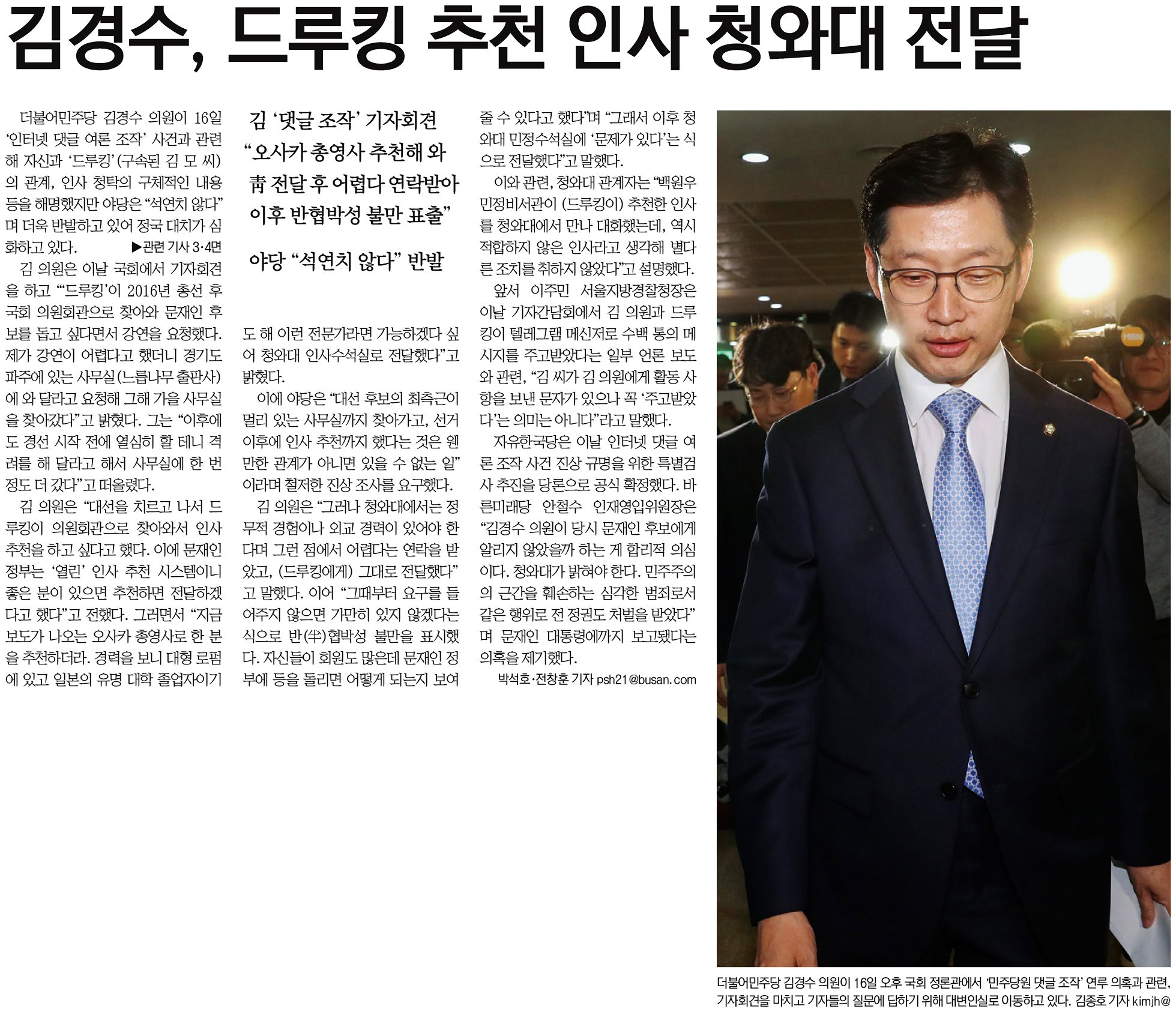 이 기사 제목 아래에 트럼프 미국 대통령과 김영철 북한 노동당 부위원장 겸 통일전선부장이 만난 사진을 실어서, 북-미 두 대표자의 만남의 의미가 ‘PK 5無(무) 선거의 원인’으로 축소되는 인상을 주었다.