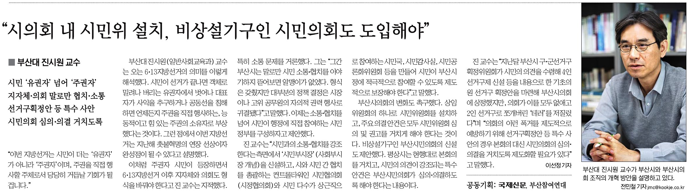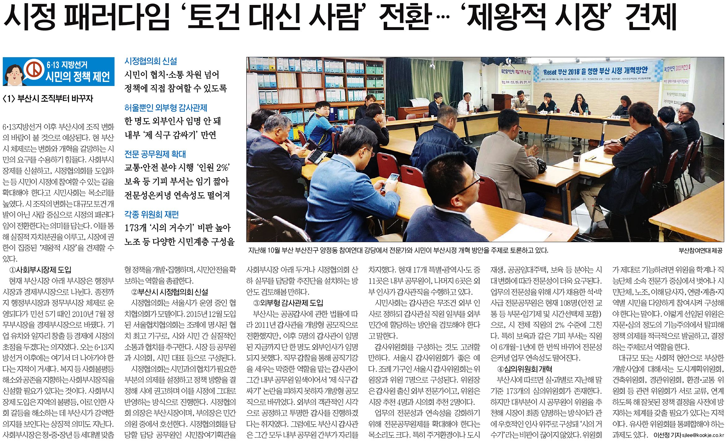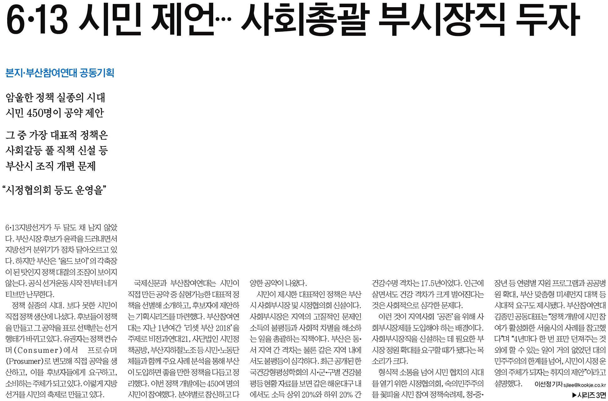 부산일보는 <‘상생 전포카페거리’ 시장, 구청장 후보 한목소리>(6/7, 2면)과 <낙동강 물 오염 “이대로 안돼” 거센 파장>(6/8, 1면)을 냈다. 부산일보는 5월 30일 1면 탑 기사로 <전포카페거리서 카페가 쫓겨난다>를 내고 임대료 상승으로 인한 둥지 내몰림 현상을 썼다. 전포 카페거리를 찾아 르포를 쓰고 앞서 같은 문제의 해결책을 찾은 서울 성동구의 사례도 전했다. 언론에서 지자체의 대책이 시급하다는 지적이 이어지자 지방선거에 나선 후보들도 응답했다. 낙동강 물 문제도 마찬가지다. 지역언론이 현안으로 주목했던 문제를 선거 시기 정책으로 연결한 좋은 사례로 꼽는다. 낙동강 물 문제도 마찬가지다.