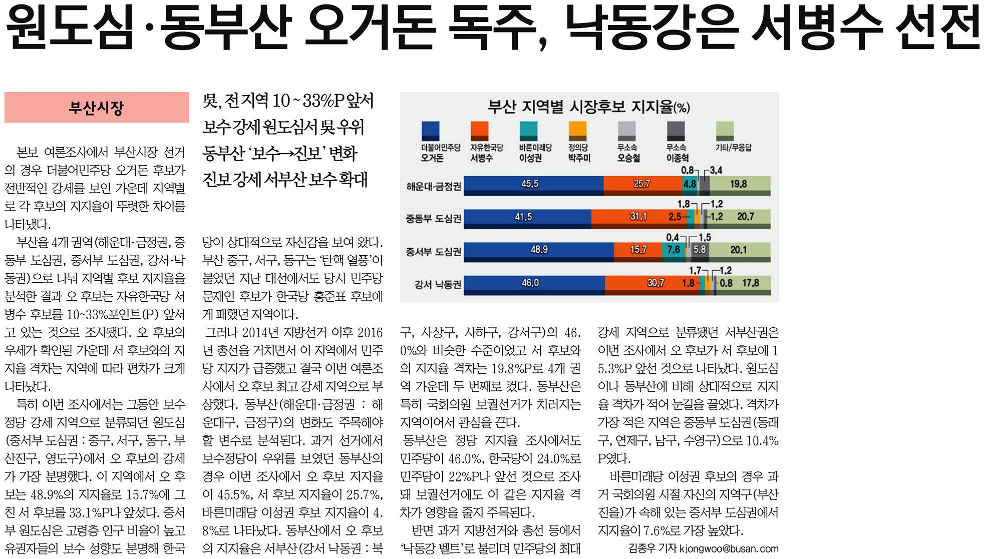 부산일보 역시 연제구청장 선거를 다룬 기사 <공천 파동에 민주 ‘지각’ 출발, 한국 ‘분열’··· 만만찮은 무소속>(6/5, 4면)에서 ‘(더불어민주당) 이 후보 측에선 전국적으로 높은 문재인 대통령의 지지율과 함께 김해영 의원의 후광이 이번 선거에 긍정적인 영향을 끼칠 것으로 기대’, ‘(자유한국당) 이해동 후보는 연제구에서 구의원 4년과 시의원 16년 등 20년의 풍부한 지방의원 의정활동 경험이 장점’이라고 서술했다.