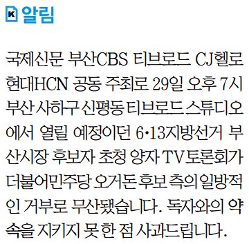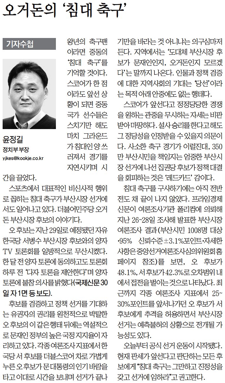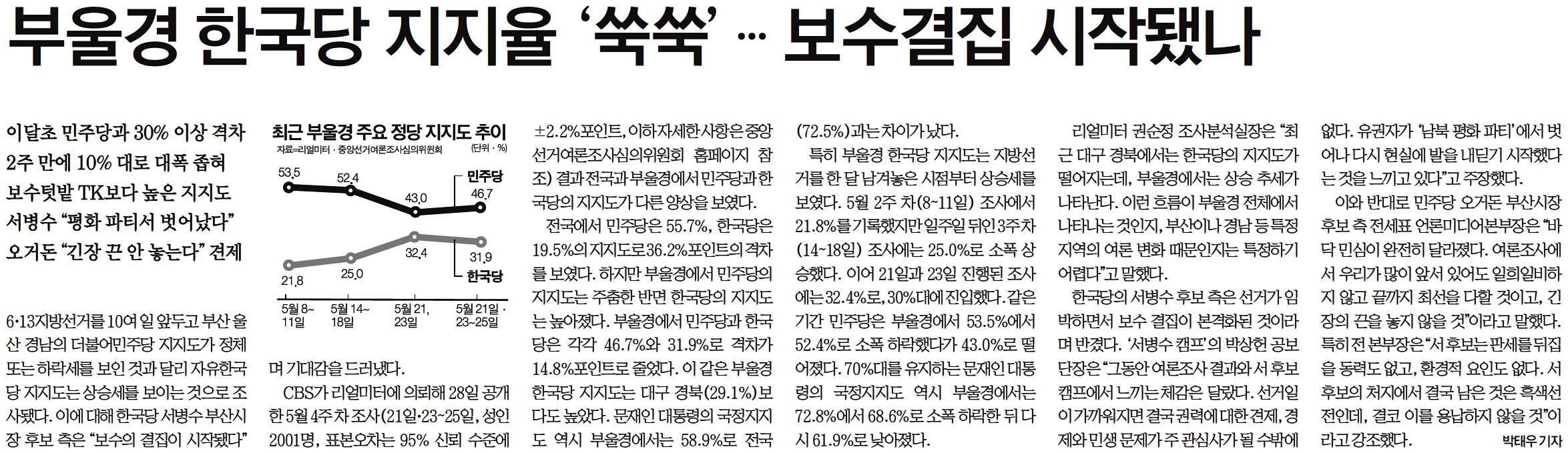 ‘보수 결집’을 사용한 기사 제목은 지난주에 이어 이번 주에도 3건 있었다. <오거돈 강세 지속··· 가덕신공항보다 보수결집이 변수>(국제신문 6/5 3면>, <홍준표 유세 중단, 부산 보수결집 물꼬 트나>(국제신문 6/5 8면>, <궁지에 몰린 보수 재결집하나>(부산일보 6/5 5면)였다. 이 기사는 새로운 상황을 서술한다기보다 숨은 보수표가 얼마나 있을지 짐작하는 기사로 저번 주와 다른 내용이 없었다.