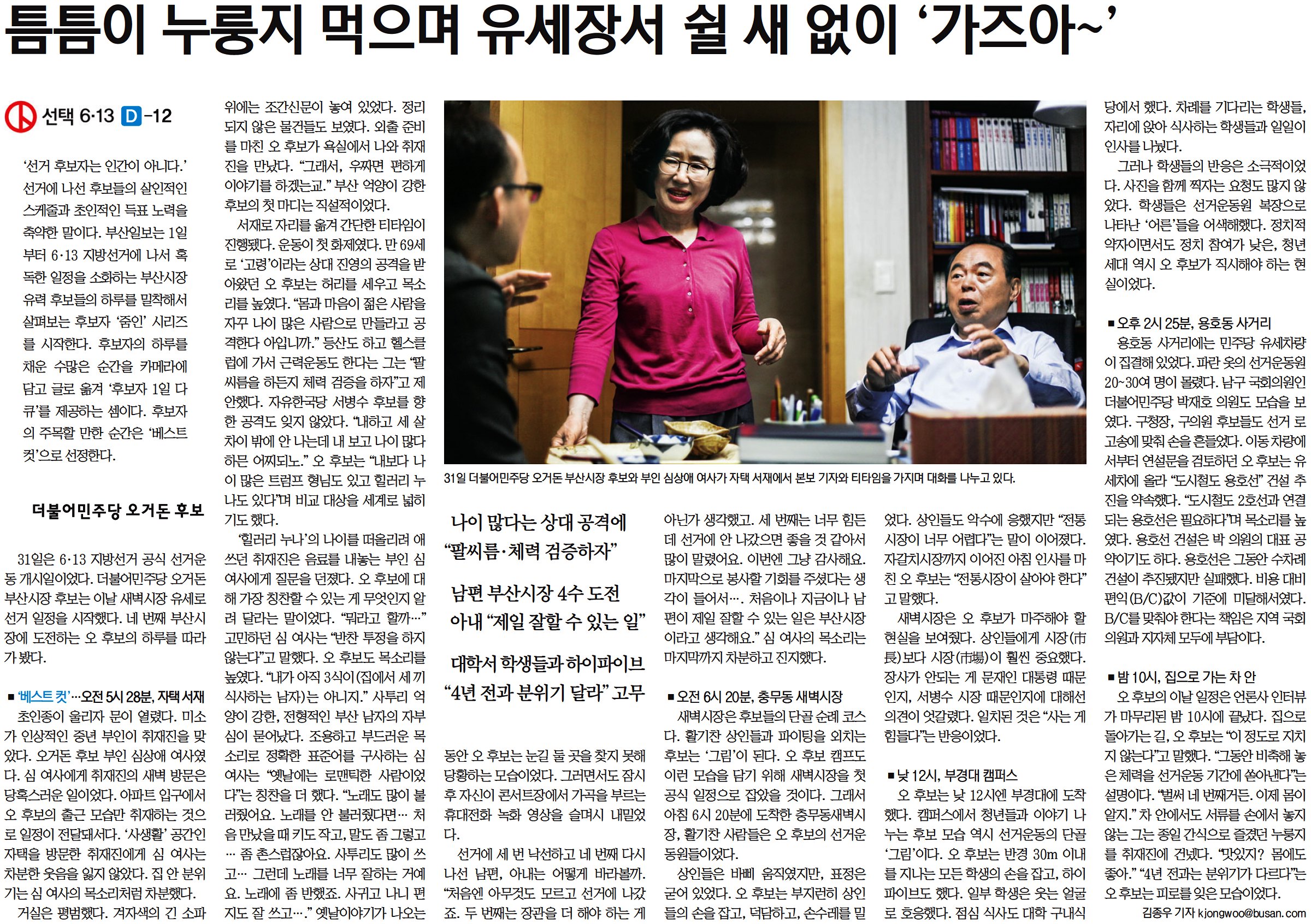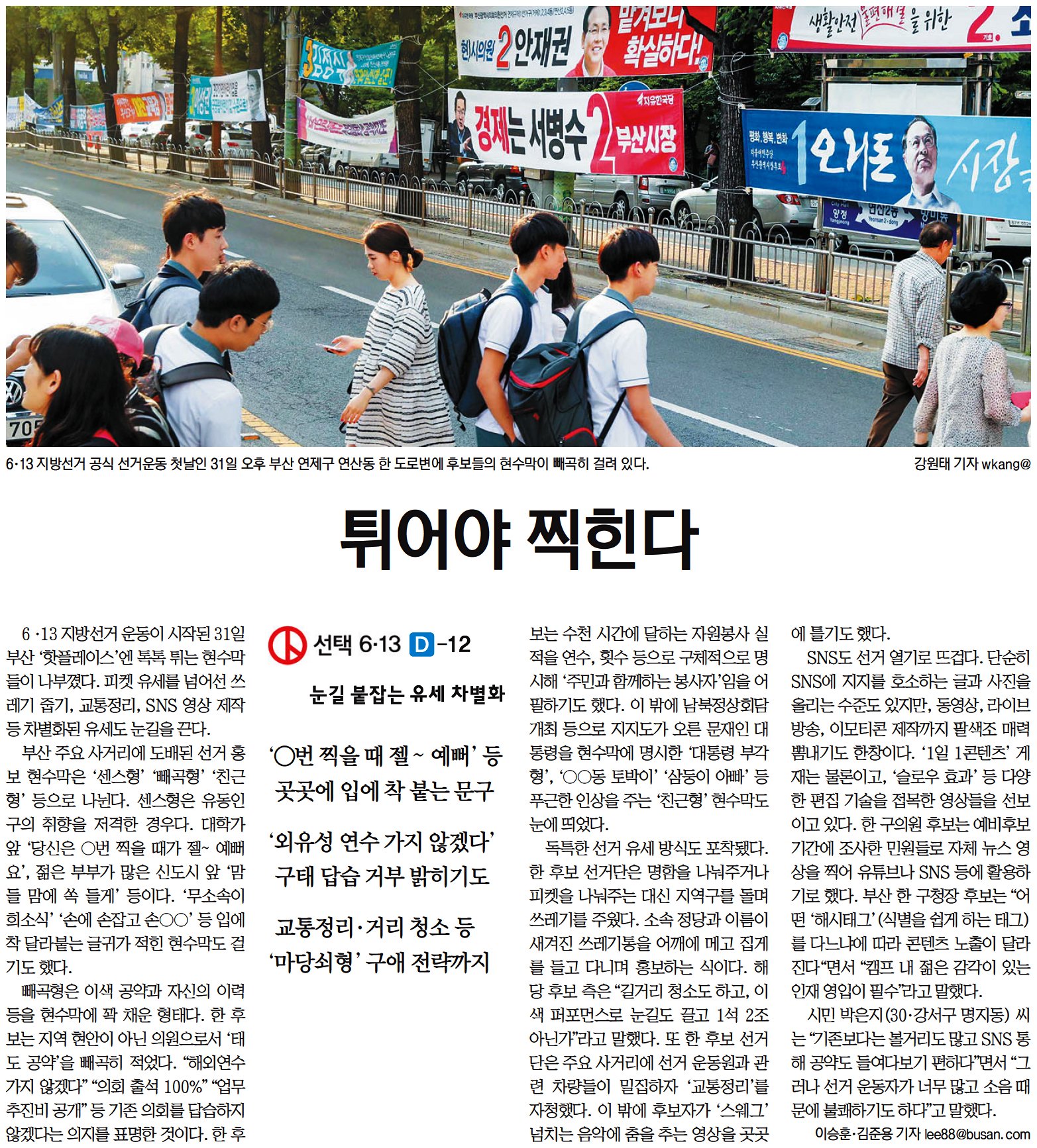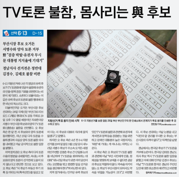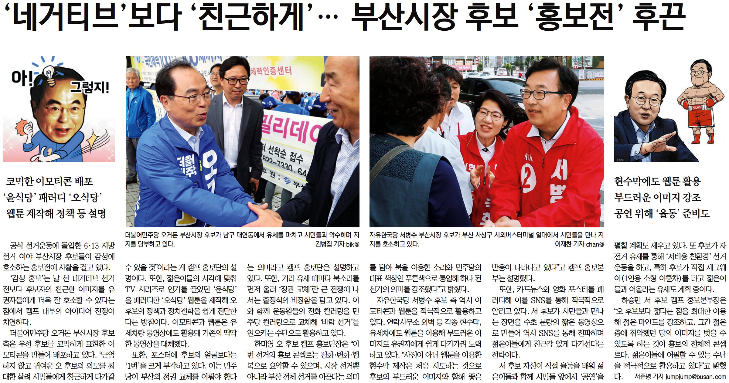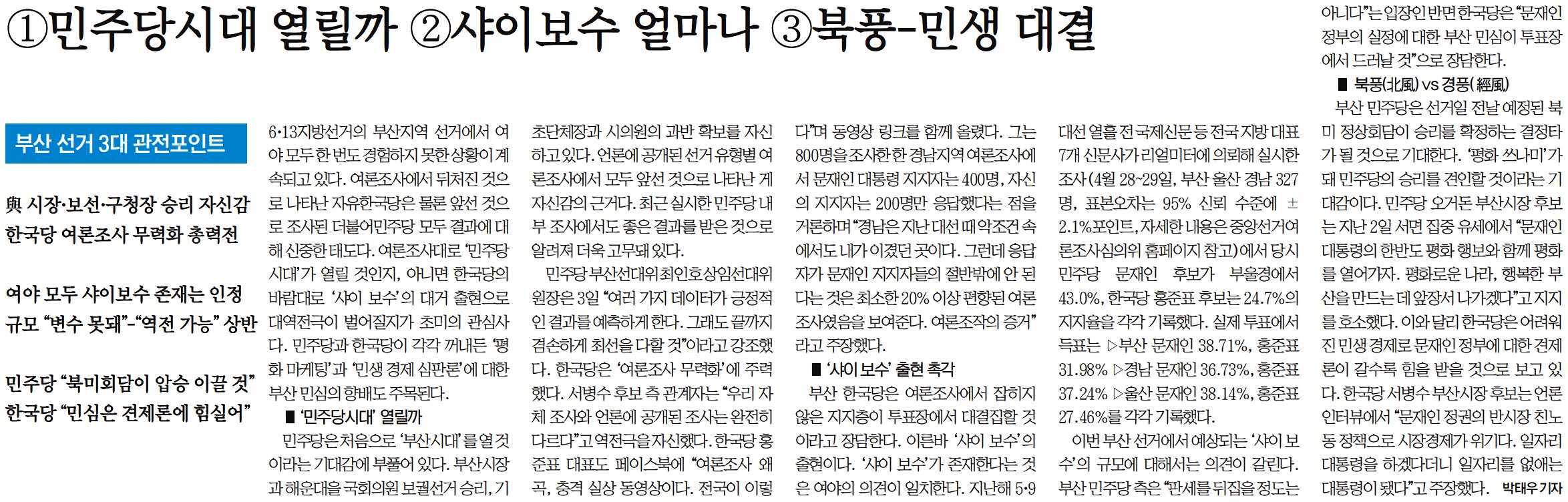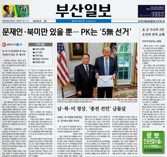 부산일보도 6월 4일 1면에 <문재인, 북미만 있을 뿐···PK선거는 5無(무) 선거>라고 썼다. 야권단일화, 선거 열기, 정책대결, 중앙당 지원 효과, 연예인 동원이 없는 선거라는 것이다. 이 기사는 ‘선거만큼 재미있는 게임도 없’고 ‘그 어떤 싸움도 선거에 비교할 바 못’되는데 유독 이번에는 ‘투표일이 9일 앞으로 다가왔는데 선거가 있는지조차 모를 지경’이라며 앞서 짚은 다섯 가지가 없는 데 대해 아쉬운 듯 서술하고 있다. 그러면서 ‘이는 조기에 굳어진 선거 판세와 북·미 정상회담을 비롯한 북풍(北風)이 부·울·경 선거를 주도하기 때문’이라고 평가했다.