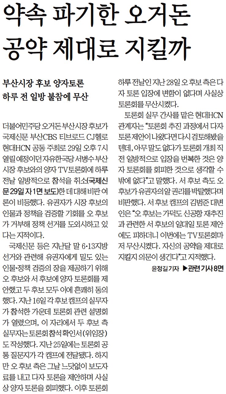 국제신문은 매니페스토 교수평가단의 광역단체장 공약 평가를 실었다. 선거가 임박한 만큼 시기적절한 기획이었다. 그러나 보도태도가 좀 더 신중했어야 한다. 6월 7일 1면에 <부울경 ‘묻지마 공약들’ 재원 대책 없이 쏟아내>라고 비판하는 헤드라인을 선택했다. 광역단체장 후보들이 내세운 공약이 대체로 방대하거나 알맹이가 없고 재원마련 대책이 부실하다는 지적을 요약했다. 평가단장의 말을 인용하면서는 ‘특히 모 후보의 공약은 총 재원이 수십 조에 이르러 현실성이 없다’고 했다. 비판적인 평가를 받은 것이 어느 후보의 공약이었는지 밝혀주는 것이 더 적절했을 것이다. 제목이 ‘부울경 묻지마 공약들’로 전부를 포괄하고 있는데다 대표적으로 허황된 공약은 누구 것인지 알려주지 않아 정치혐오가 우려된다. ‘유일하게 준비가 잘 된 후보’로 울산시장 선거에 나선 김기현 후보를 꼽은 것처럼, 부실했던 후보도 이름을 밝혀 옥석을 가리는 것이 바람직하다.