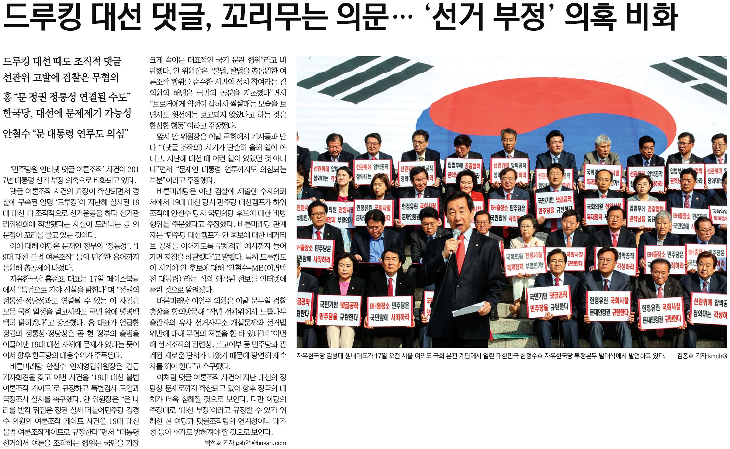 국제신문은 6월 8일 <보수, 폭망하고 나면…>이라는 칼럼을 냈다. 이 칼럼은 ‘평화이슈의 바람이 보수진영을 완전히 덮쳐’버려서 ‘이번 지방선거는 보수의 무덤’이 될 것이란 전망을 내놓고 있다. 그러면서 여당이 압승한다면 ‘견제 세력 없는 권력은 부패할 수밖에 없고, 그 피해는 국민에게 돌아’간다는 점을 우려한다. ‘이번 기회에 보수를 재정비’해야 하는데 그러기 위해서는 ‘지금이라도 당 지도부가 모든 기득권을 버리고 최선을 다하는 진정성을 보여준다면 폭망하더라도 2년 뒤에 있을 2020 총선에서는 보수 부활의 신호탄을 쏠 수 있을지도 모른다.’라는 충고로 마무리한다.