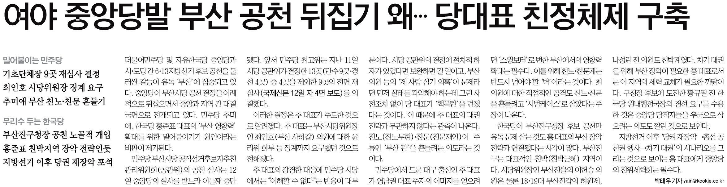 <보수 텃밭 민심 달라졌다>에서는 전문가 인터뷰에서 여론조사 결과를 두고 “보수정당 후보라고 무조건 지지하는 게 아니라 보수정당이든 진보정당이든 부산을 살릴 후보를 보고 투표를 하는 분위기가 형성되었다”고 분석했으나, 제목에서부터 ‘부산이 보수 텃밭’ 이라는 인식을 그대로 드러냈다. 대통령의 국정수행능력 평가와 후보 지지도를 연결시켜 중앙에 종속되는 듯한 인상을 주기도 했다.