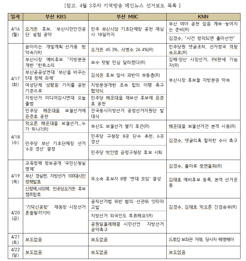 ○ 모니터 대상 : KBS부산, 부산MBC, KNN 메인뉴스 선거보도 (*경남은 경남도지사 선거만 포함)