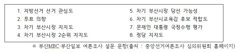 각 당의 부산시장 후보와 교육감 후보가 확정된 후 첫 여론조사라서 기대감도 컸으나 후보 지지도에 집중되었다. 유권자들이 바라는 후보의 자질이나, 지역 정책은 이번 여론조사 문항에서 빠져있어 실망감을 안겼다. 또 여론조사 질문에서 부산시장 후보는 ‘당선가능성’을, 교육감 후보에 대해서는 ‘적합도’를 물었는데 두 문항이 갖는 의미는 무엇인지, 교육감 후보에 대해서는 왜 ‘적합도’인지에 대한 해설은 없어 유권자에게 친절하지 않았다.