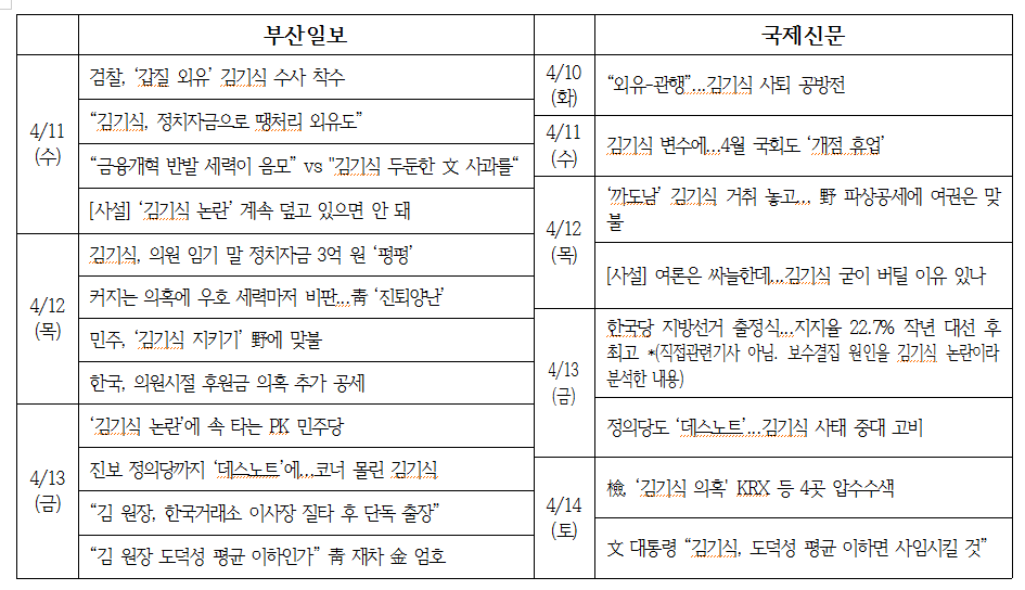 한편 KNN의 선거 판세보도에서 나타나는 선정적인 표현도 아쉽다. 4월 17일 <민주당원 댓글조작, 선거정국 격랑속으로>에서는 ‘태풍’, ‘도화선’, ‘총공세’라며 자극적인 표현을 사용하였고, 4월 20일 <김경수·김태호 막오른 진검승부>보도에서는 제목부터 ‘진검승부’라는 게임용어, 전쟁용어를 사용했다. 이런 표현들은 정치혐오를 부를 우려가 있음을 잊지 않아야 한다.