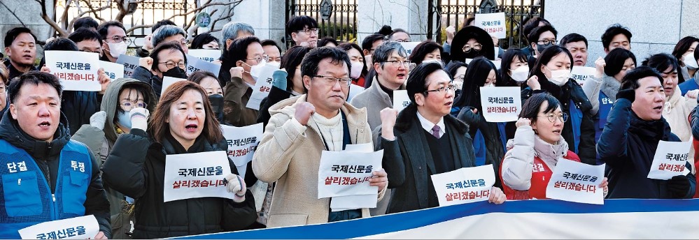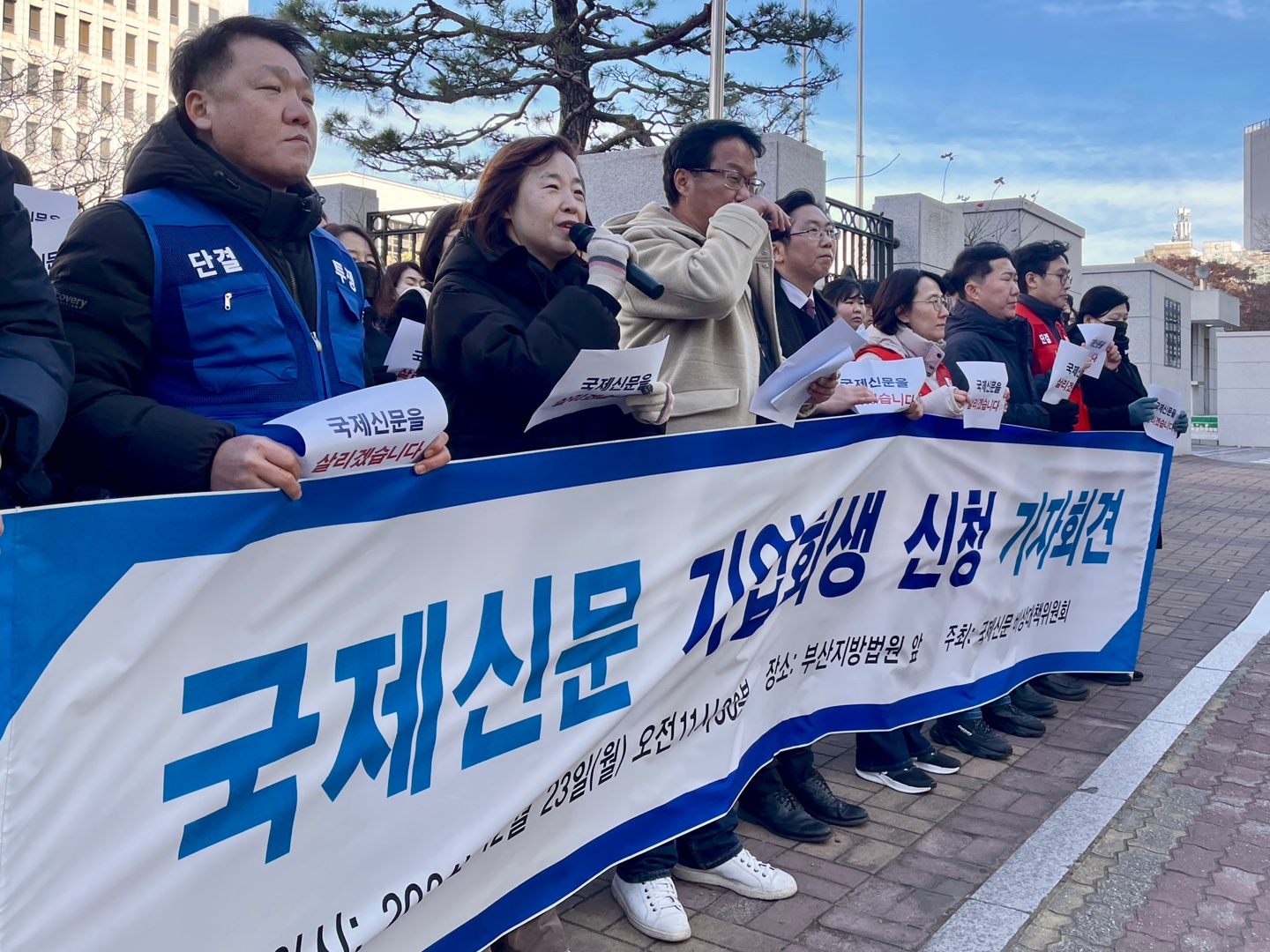 국제신문 비상대책위원회가 12월 23일 국제신문 기업회생 신청 기자회견을 부산지방법원 앞에서 진행했습니다. 대주주 능인선원과의 완전한 결별을 위한 법적 절차에 들어간 것인데요, 임금 및 퇴직금을 받지못한 전·현직 기자와 업무 부문 사원 등 147명이 채권단으로 참여해 기업 회생을 신청했습니다.