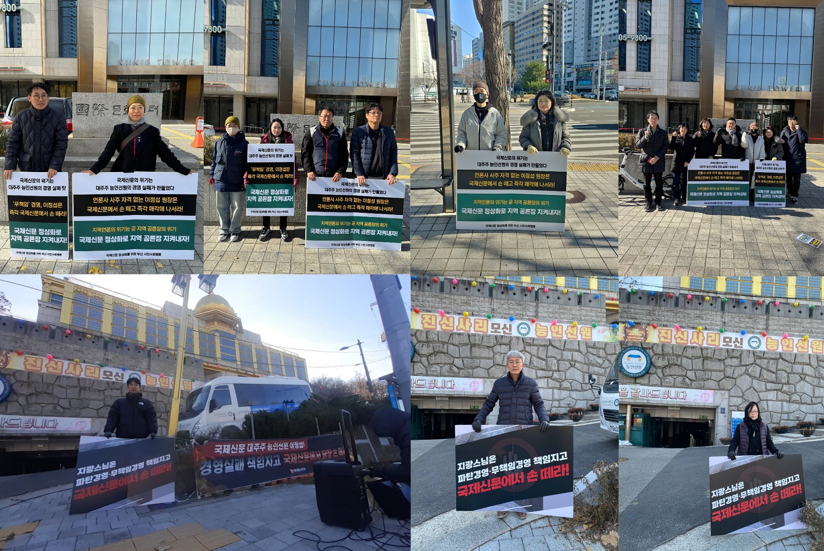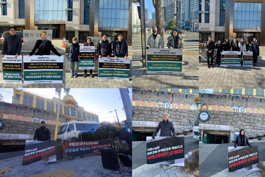 12월에는 매주 화요일 국제신문 앞, 대주주 능인선원 앞에서 능인선원 책임을 촉구하는 1인시위를 진행하였고, 국제신문 정상화를 위한 지역사회 집담회, 기업회생 신청 기자회견에 함께 했습니다.