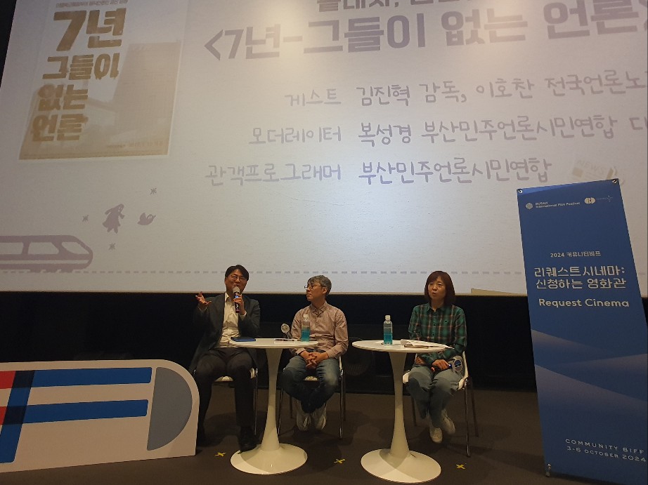 올해 부산국제영화제에선 특별한 영화가 상영됐는데요. 부국제 커뮤니티비프 리퀘스트시네마 섹션에 부산민언련이 신청한 영화 <7년, 그들이 없는 언론>이 선정된 것입니다.