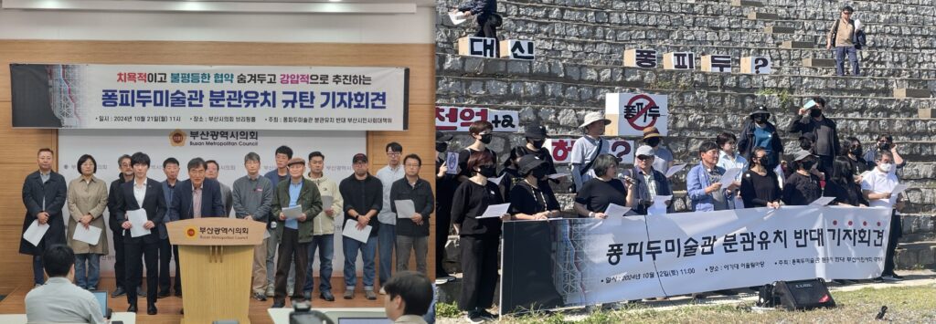10월 21일 부산시의회 브리핑룸에서 진행된 퐁피두미술관 분관 유치 기자회견에도 참여했습니다. 퐁피두미술관 분관 유치 반대 부산대책위가 주최한 이번 기자회견에서는 지난 14일 국토교통위원회 국정감사에서 공개된 부산시와 퐁피두미술관 사이의 분관 유치 협약 내용을 지적하며 불평등한 계약이라고 비판했습니다. 협약을 보면 전시 기획 시 퐁피두의 허가가 있어야 하는 협약인 데다가, 매년 60억 원의 로열티를 부담해야 하고, 로열티 지급 시 발생하는 세금까지도 부산시가 부담해야 하는 등 불공정하다고 지적했습니다. 더구나 작품 전시 시 발생하는 보험, 운송, 전시, 교육 프로그램도 부산시가 부담해야 해 부산 시민의 세금 낭비가 크다는 겁니다. 더구나 퐁피두 분관 유치를 추진하면서 미술계, 시민사회와 소통 없는 일방적 추진도 비판하며, 즉각적인 중단을 촉구했습니다.