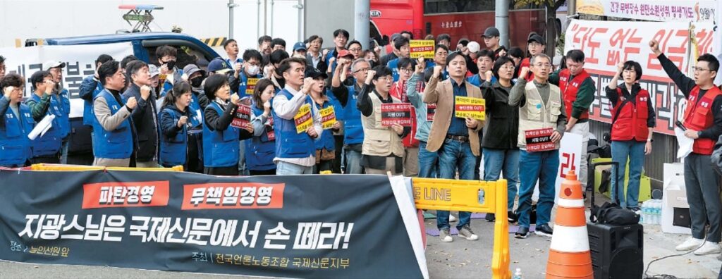 이에 국제신문 노사가 대주주 에 맞서 총력투쟁에 나섰습니다. 10월 21일 서울 능인선원 앞에서 국제신문 비상대책위원회 출범 선포 및 능인선원 전 사원 총력투쟁 기자회견을 가진데 이어, 27일에는 전 사원 총력집회와 함께 전국언론노동조합 국제신문지부 출범식을 개최했습니다.