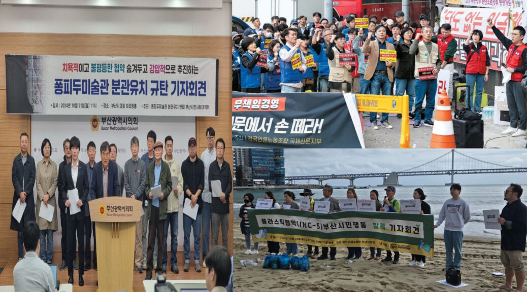 이밖에도 부산시민연대는 부산시민 목소리 외면하고 일방 추진하는 <‘퐁피두센터 부산’ 운영 방안 마련을 위한 부산시 라운드테이블 개최에 대한 부산시민운동단체연대 입장> 발표(11/15), <부산시 교통카드 시스템 사업자 선정에 대한 입장> 발표(11/18) 등 시정 비판 입장을 냈습니다.