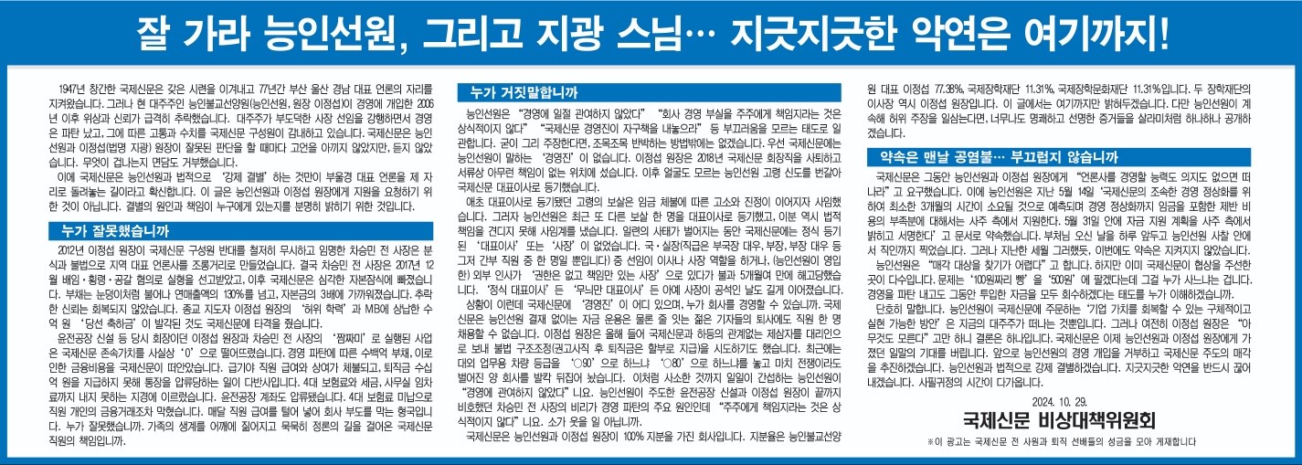 부산지역 대표 일간지 국제신문이 심각한 위기에 처해있습니다. 대주주 능인선원(회장 이정섭)의 무리한 윤전 공장 설립에 따른 부채 증가를 국제신문이 떠안게 되면서 심각한 경영 위기를 맞았고, 국제신문 구성원의 임금 체불과 퇴직금 미지급이 일상화되고 있습니다.