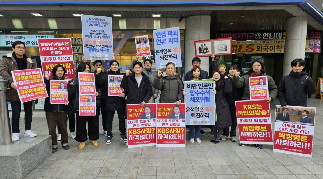 부산민언련 회원들은 11월 30일(토), 서면에서 열린 [윤석열퇴진 부산시민대행진]에서 ‘KBS사장 박장범 OUT’을 외치며, 피켓팅과 행진을 진행했습니다.