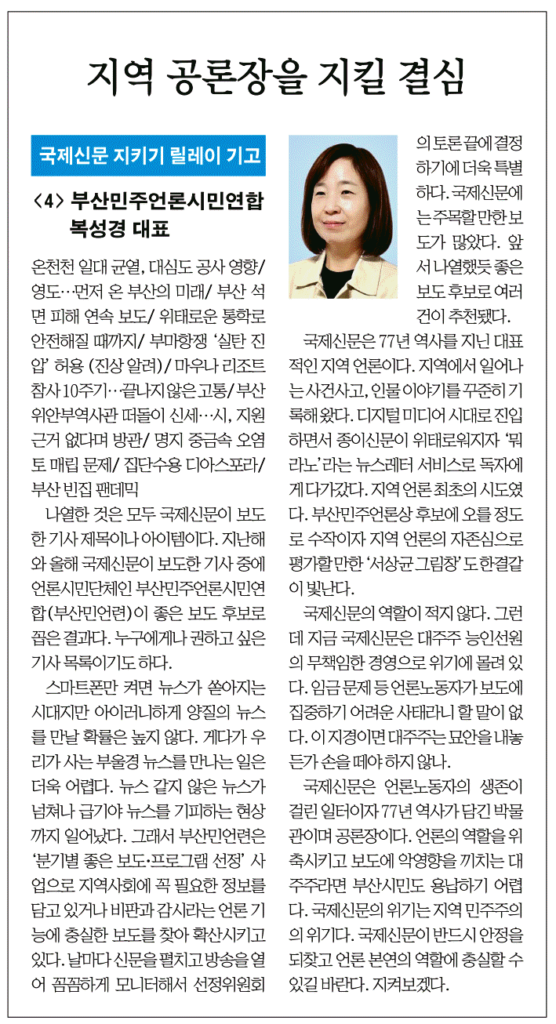 부산민언련 복성경 대표가 쓴 <지역 공론장을 지킬 결심>(국제신문 지키기 릴레이 기고문) 중 일부를 공유합니다.
