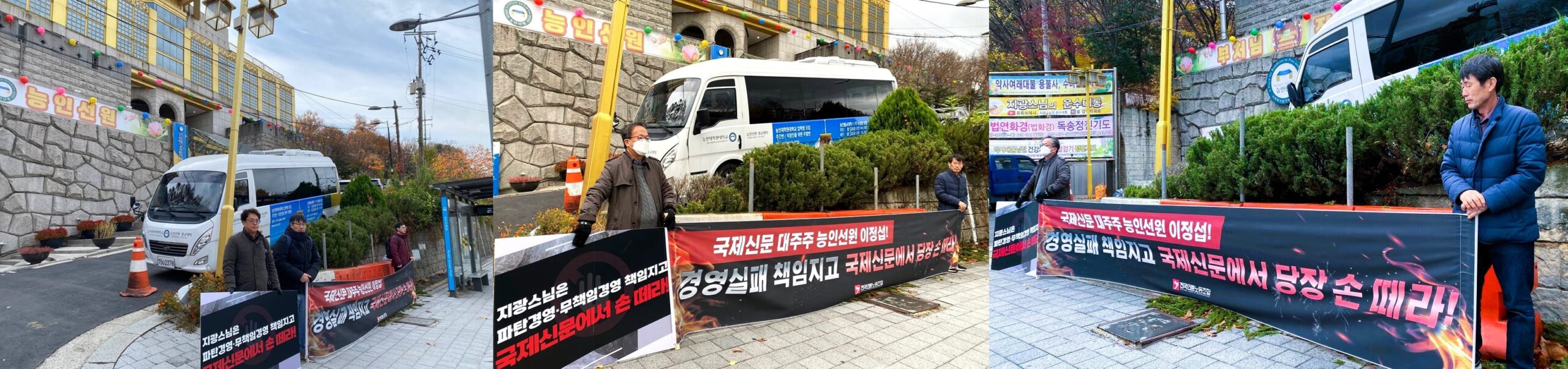 부산 국제신문사 앞 뿐만 아니라, 서울 능인선원 앞에서 사태해결을 촉구하는 피켓시위를 진행했습니다. 언론노조 헤럴드신문지부, 연합뉴스지부, 뉴시스지부, 경향신문지부, 서울신문지부 등이 힘을 모아주셨습니다.