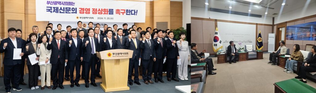 시민사회 뿐만 아니라 부산정치권도 힘을 모으고 있습니다. 국제신문 보도(<부산시의회도 나섰다, 국제신문 경영 정상화 촉구> 11/11, 1면)에 따르면 부산시의회 송상조 행정문화위원장은 “이르면 이번 주 중 전체 의원 46명을 대상으로 공론화 과정을 거쳐 기자회견 등 국제신문 경영 정상화를 촉구하는 공동 행동에 나설 계획”이라고 밝혔고, 11월 20일 기자회견을 시행했습니다. 또 같은날 언론공공성연대•국제신문 노조와 부산시의회 의장 간 간담회도 진행했습니다.