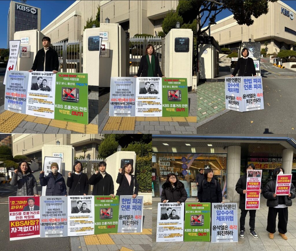 부산민언련 회원들은 부산시민들에게 박장범 사장 임명 문제를 알리기 위해 ‘KBS사장 박장범 OUT’ 피켓 선전을 진행한 것인데요. 공영방송의 정치적 독립성을 훼손하고 마구잡이로 언론장악을 진행하고 있는 윤 대통령에 대해 시민들과 함께 분노의 목소리를 모았습니다.