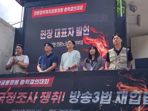 28일 기자회견에서는 서울시 지원 중단을 나흘 앞둔 서울시 미디어재단 TBS 상황과 방심위의 과도한 심의에 대한 비판, 유진그룹이 내리꽂은 YTN 낙하산 사장 김백의 불공정 행위, 박민 KBS 사장 취임 이후 벌어진 편성제작 자율권 침해 등 윤석열 정부의 언론장악 행태에 대한 성토가 이어졌습니다.