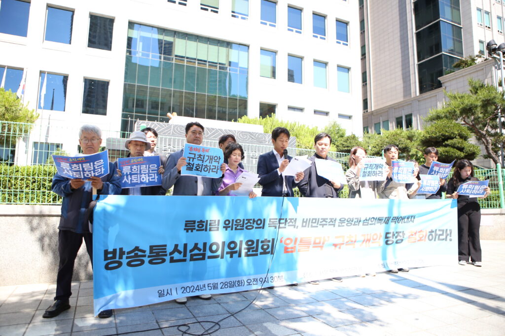시작은 윤석열 대통령 낙하산 류희림 위원 위촉이었다. 여권 추천 위원들은 군사작전 하듯 강행한 호선에서 그들만의 의결로 ‘류희림 위원장’을 선출했다. 이후 방송통신심의위원회는 공영방송과 비판언론을 겨냥한 심의폭주를 일삼으며 언론탄압 도구로 전락했다는 비판에 직면해 있다. 이제 ‘류희림 체제’ 방송통신심의위원회는 합의제 기구라는 외피마저 포기하려고 한다. 방송통신심의위원회 기본규칙 개정안과 소위원회 구성 및 운영에 관한 규칙 개정안 등 이른바 ‘입틀막’ 규칙 개악을 통해서다.