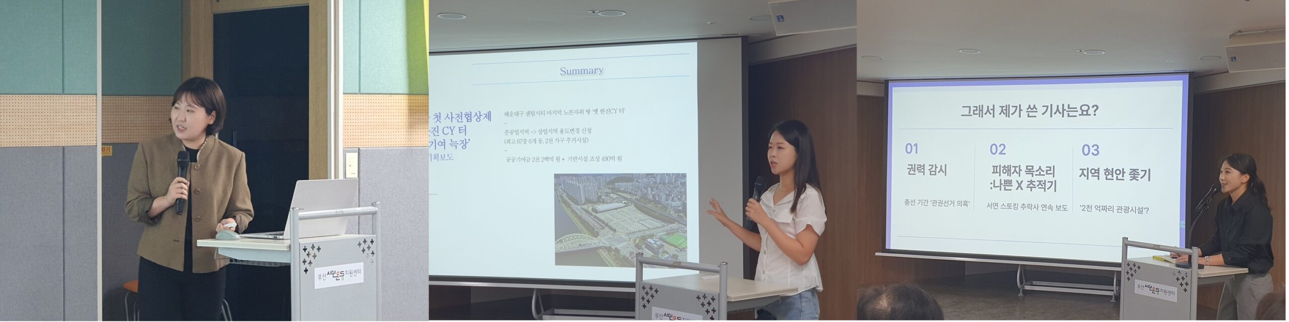 지역언론인과 시민의 소통을 위한 시간이었는데요, 국제신문 정지윤 기자, KBS부산 최위지 기자, 부산MBC 조민희 기자가 함께 했습니다. 세 기자 모두 ‘분기별 좋은 보도ㆍ프로그램’을 수상한 공통점이 있습니다.