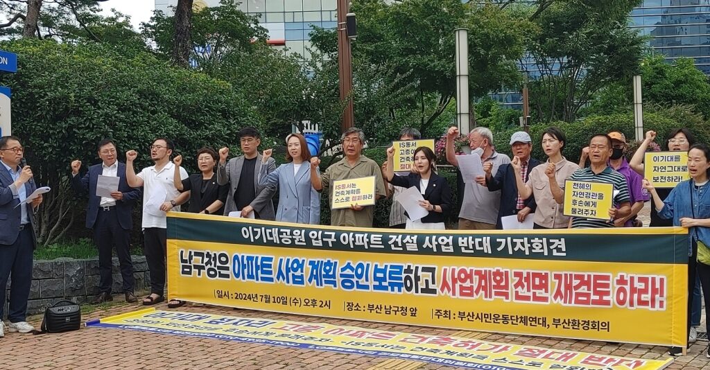부산시민운동단체연대는 7월 10일 남구청 앞에서 기자회견을 열고 ‘남구청은 아파트 사업 계획 승인을 보류하고 사업계획 전면 재검토하라!’고 촉구했습니다.