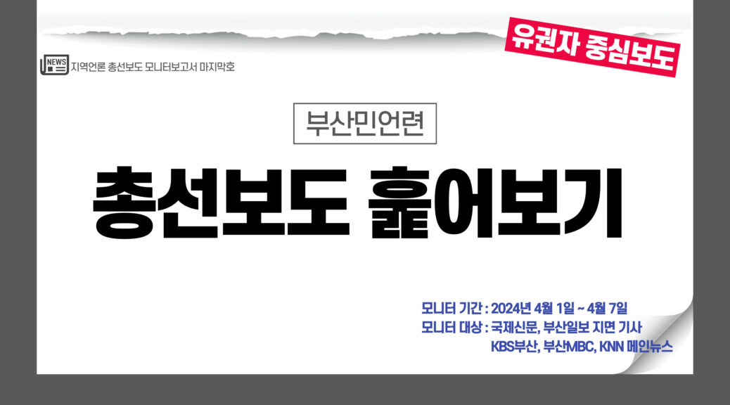 부산민언련 <2024 총선 시민모니터단>이 투표 전 유권자 선택에 도움되는 정보를 줄 수 있는 선거 기사를 소개합니다.![]() 부산MBC [21대 우리지역 국회의원 성적표] 22대 총선에 앞서 21대 부산과 대구의 국회의원의 비용 사적 사용 논란, 낮은 출석률와 법안발의률, 지역현안 해결 능력 부족 등 의정 활동을 구체적으로 짚었습니다. 투표 전, 우리지역 국회의원 자격을 유권자로 하여금 생각게 하는 프로그램으로 추천합니다. <빅벙커_21대 국회의원 성적표 1부>(2/1) <빅벙커_21대 국회의원 성적표 2부>(2/8) https://www.youtube.com/embed/rzUloET3pOk 이번 선거 기간 지역언론에서 보기 힘든 기사가 바로 ‘후보 검증’ 보도였습니다. 정당이 서로 검증했거나 고발한 내용을 상호 공방, 갈등으로 보도한 기사는 넘쳐났지만 직접 검증은 드물었지요. 그런 가운데 부산MBC, 국제신문은 구청장의 같은 당 후보 지원 사실을 공론화했습니다. 지역언론은 아니지만 뉴스타파는 <22대 총선 후보 검증> 기획을 적극 보도했는데 부산지역 후보가 포함되기도 했습니다. 불법 선거, 재산 형성 의혹 보도를 소개합니다. 부산MBC 사하구청장 관권선거 감시 보도 <“우리 편 돼달라”.. 구청장 선거법 위반 의혹>(3/27) <′특정후보 지지 전화′ 사하구청장..선관위, 정치중립 위반 조사 착수>(3/28) <“도읍이 없이 못 살아” 구청장 개입 또 논란>(4/1) 국제신문 강서구청장 관권선거 감시 보도 <[단독] 부산 구청장들, 같은 당 총선후보 노골적 홍보 물의>(3/29) 뉴스타파 <22대 총선 후보 검증> 기획 뉴스타파는 <22대 총선 후보 검증> 기획을 진행하며 국회의원 후보의 선거관리위원회(선관위)에 등록한 자신의 재산·병역·납세 등 개인 정보를 수정한 내용, 검찰 출신 후보 소득세 증가 현황 검증을 진행했습니다. 재산 신고 변경, 소득세 증가 후보군에서 부산지역 후보도 포함되어 공유합니다. <검사 출신 박균택·주진우, 퇴임 직후 소득세 수십배 급증>(4/5) 뉴스타파 <22대 총선 후보 검증> 전체 보기 지역언론은 저마다 기획기사를 마련해 지역구별로 지역 현안과 후보의 주요 공약을 전했습니다. 언론사별로 소개합니다. ☘️국제신문 [우리 동네 후보 공약은?] 국제신문은 부산 18곳 여야 후보 대표공약을 3개씩 받아 경향성 분석했고, 홈페이지에도 공개했습니다. <대학병원 유치, 부산형 급행철·도시철…여야 한목소리 공약>(3/28) [우리 동네 후보 공약은] 바로가기 [4·10 총선 지역 핫이슈] 지역 현안에 대해 현재까지의 사업 추진 경과와 부산시·정부의 향후 추진 계획을 소개하고, 후보의 입장도 전해 해당 현안에 대한 이해를 높혔습니다. 3/11 4·10 총선 지역 핫이슈 <1> 남구 ‘오륙도선’ 3/21 4·10 총선 지역 핫이슈 <3> 해운대 신시가지 정비 사업 3/22 4·10 총선 지역 핫이슈 <4> 산업은행 본점 남구 유치 3/28 4·10 총선 지역 핫이슈 <6> 금정 침례병원 공공화 4/1 4·10 총선 지역 핫이슈 <7> 화명동 표심 잡아라 4/3 4·10 총선 지역 핫이슈 <8> 교정시설 통합 이전 4/5 4·10 총선 지역 핫이슈 <10> 원도심 숙원 고도제한 ☘️부산일보 [여야 후보 공약 점검 보도] 여야 후보들의 도시철도 신설 공약을 평가, 글로벌허브특별법과 부울경 메가시티 고약 현실성 점검 기사를 실었습니다. <쏟아지는 도시철도 공약… 계속되는 ‘희망 고문’>(1면, 3/27) <‘4년 전 데자뷔’ 부실 공약에 부산 유권자 한숨>(1면, 3/29) [유권자 공약에 대한 후보자 답변은?] 부산일보는 부산 유권자로부터 제시받은 79개 공통 공약을 후보자에게 전달했는데요, 총 28명의 부산 여야 후보가 응답했습니다. <공약 실종 선거에서 유권자 제안 ‘공통 공약’이 등대 되다>(4면, 4/8) ☘️KBS부산 <공약맞수K> 지역구 현안에 대한 후보자들의 생각을 물어보고 입장을 소개했습니다. 우리 지역의 현안이 무엇인지, 또한 후보자들의 입장은 무엇인지 확인할 수 있는 기사입니다. <공약맞수K> 한 번에 보기 [공약자문단의 부산공약 평가는?] 공약 신선함, 여야 차별성, 구체적 실행방안과 예산마련 계획을 점검했습니다. <여야 부산 공약 분석…“재탕에 차별성 부족”>(4/3) <여야 부산 공약 분석…“실현 가능성 의문”>(4/4) ☘️부산MBC [제22대 총선 격전지 공약 돋보기’] 부산MBC는 각 후보의 주요 공약과 실현방안, 부산의 가장 큰 문제 등에 대한 질의서를 후보들에게 보내 답변을 받고 이를 보도했습니다. 또 전문가 평가도 함께 실어 공약을 살필 때 유심히 판단해야 될 지점을 알렸습니다. <인구소멸 중·영도구, 후보들 정책공약은?>(3/28) <신설 ′북구 을′..′교육·교통′ 키워드>(3/29) <연제구, 도시철도 vs 검찰개혁>(3/31) <사상구, 공업지역 탈바꿈 어떻게?>(4/1) <부산진구 갑, ‘도시철도’ 공약 격돌>(4/2) <현역대결 남구 ‘산업은행 이전 공약’ 차이는?>(4/4) <전 법률비서관 vs 전 구청장…“인프라 구축”>(4/7) <복지 사라지고 도시철도·재개발 공약 수두룩>(4/8) ☘️KNN [기획보도 ‘선택 2024’] KNN은 부산경남 주요 격전지 후보와 주요공약을 소개했습니다. 해당 지역구의 특성, 선거구도, 후보들의 출마의 변과 주요 정책 전했습니다. <부산진갑, ‘지역 전문가’ vs ‘교육 전문가’>(4/2) <부산 연제구, ‘3선도전’ VS ‘첫 진보당 입