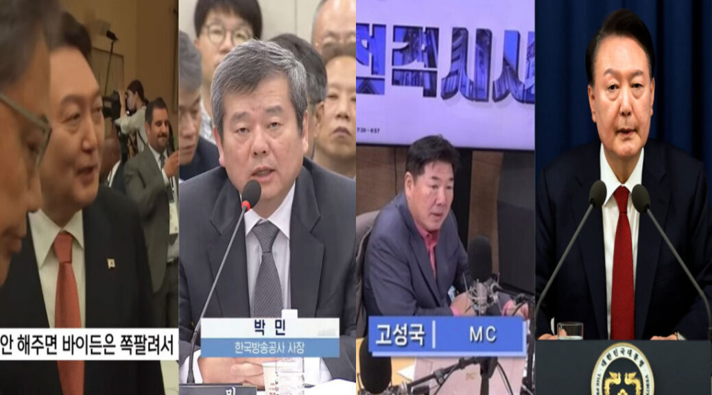 #장면1. 2022년 9월 미국에서 열린 글로벌펀드 제7차 재정공약회의. 윤석열이 비속어를 사용한 사건이 발생하였다. 당시 윤석열이 바이든과 만난 회의장을 나오면서 한 발언이 MBC 카메라에 포착되었다. 대부분 언론사는 비속어 사용을 보도하였다. 대한민국 정부는 공식 입장문을 통해 “미국 이야기가 나올 리가 없고 바이든이라는 말을 할 이유는 더더욱 없다”며 언론이 왜곡했다고 반박하였다. 11월 9일 대통령실은 MBC 기자 전용기 탑승 불가를 통보하였다.