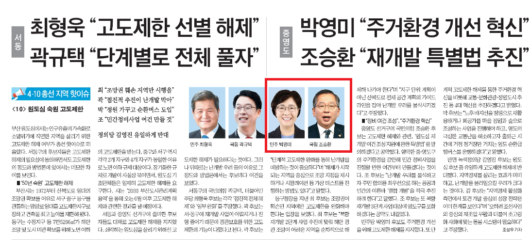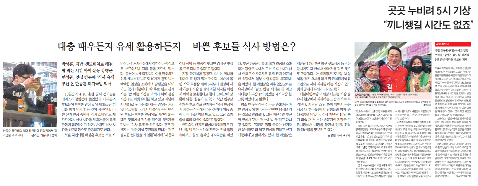‘시민의 현명한 선택’ 강조한 지역언론 유권자 알 권리 보도 충분했나 선거가 막바지에 이르렀다. 지난주 국민의힘 한동훈 비상대책위원장과 더불어민주당 이재명 대표는 각각 부산을 방문해 후보 지원 유세에 나섰다. 사전투표일에는 대통령이 부산을 방문해 직접 투표에 임하기도 했다. 이를 두곤 야당과 시민사회에서는 선거 개입이라며 비판했다. 지난 3월 29일부터 시작된 선관위 주관의 TV토론회는 지난 4월 4일까지 진행됐다. 사전투표가 있었던 지난 한 주 동안, 지역언론은 어땠는지 살펴봤다. 선거유세 현장, 단순 전달하거나 여야 공방전 프레임으로 전해 후보 ‘끼니’ 걱정하고 이색 선거운동에 주목 지난 3월 28일, 공식 선거운동이 시작하면서 지역언론은 후보들의 선거유세 현장에 주목했다. 대부분 선거유세 현장 분위기와 여야의 발언을 전하는 데 집중했다.1) 이 과정에서 여야 공방에 주목하거나 거대 양당의 선거 유세만 주목하는 양상을 보였다.2) 선거운동 현장을 보도하면서 유권자에게 다소 불필요한 정보를 전하기도 했다. 국제신문은 ‘후보 24시’라는 기획 코너를 마련해 직접 기자가 후보자와 함께 선거유세를 다니며 현장 분위기를 전했다. 주로 지역 주민의 반응과 함께 후보 행보를 단순 전달하는 데 그쳤다.3) 다소 불필요한 정보를 전하기도 했는데, 후보자가 ‘끼니를 거르며 선거운동에 임하고 있다’던가 ‘국밥의 힘으로 강행군을 버티고 있다’는 등 후보자가 얼마나 고생하고 있는지를 부각하는 보도가 있었다.4) 부산일보도 바쁜 선거운동 간 후보자들은 어떻게 식사를 해결하는지 알아보는 기사가 있었다. <대충 때우든지 유세 활용하든지… 바쁜 후보들 식사 방법은?>(4면, 4/3)에서 후보자들은 제각각 식사를 해결한다며, 식사 시간을 줄이던가 반대로 식사 시간을 선거운동으로 활용한다고 전했다.5) 유권자가 궁금할 공약이나 후보자 검증에 대한 내용이 아니라 후보들의 식사 스타일에 대한 보도로, 다소 지면 낭비에 가까운 기사였다. ▲좌 : 부산일보 4월 3일 4면 우 : 국제신문 4월 1일 4면 이색 선거운동을 조명하는 사례도 많았다. 국제신문은 동물 인형탈이나 LED 조끼 등을 이용해 선거유세에 나선 후보자들을 소개하거나 젊은 유권자를 노리는 후보들의 전략을 알리기도 했다.6) 부산일보도 후보마다 제각각 다른 선거운동 전략을 주목했다.7) KNN은 후보자들의 SNS 선거운동에 주목하기도 했다. 후보자들이 유명 영화나 노래를 패러디한 선거영상을 제작해 “딱딱한 정치의 벽을 허물고 유권자들에게 친근하게 다가가고 있다”고 언급했다.8) 부산일보, 여야 각각 우세한 지역구 소개하며 여당 입장에 주목 국제신문, 중ㆍ영도 소식 전하며 사진은 거대 양당 후보만 실어 부산일보는 <진보당에 놀란 부산 국힘, 현역까지 가세 ‘십자포화’>(3면, 4/5)을 통해 연제에서 진보당 노정현 후보가 국민의힘 김희정 후보를 크게 앞서는 것으로 나타나자 국민의힘이 긴장하고 있다고 전했다.9) 제목은 진보당 약진에 국힘이 놀랐다는 점에 주목했지만, 실제 기사 내용은 진보당을 공격하는 국힘의 원색적인 비난 발언으로만 채워져 있었다. 군소정당인 진보당의 약진에 주목한다기보단 국힘의 반응과 입장에만 초점을 둔 기사였다. 반면, 국힘이 우세한 지역을 보도할 때 다른 양상을 보였는데, <낙동강 벨트 사상 국힘 우세 비결은?>(3면, 4/5)을 통해 국민의힘 김대식 후보의 발품과 본격적인 지원에 나선 3선 장제원 의원의 조직이 일으킨 ‘시너지’로 국힘이 사상에서 우세하고 있다고 분석했다.10) 앞서 진보당의 약진이 가능했던 이유를 분석하기보다 국힘 발언에 초점을 맞췄던 것과는 다른 보도였다. 국제신문은 <4.10총선 지역 핫이슈 <10> 원도심 숙원 고도제한>(5면, 4/5)에서 중영도의 현안인 고도 제한 해제와 관련한 후보들의 입장을 전했다.11) 기사 본문에선 더불어민주당 박영미, 국민의힘 조승환, 녹색정의당 김영진 후보의 입장을 모두 전했지만, 사진은 박영미, 조승환 후보만 배치해 해당 지역구가 양자구도로 치러진다는 오해를 불러일으켰다. ▲국제신문 4월 5일자 갈무리 선관위 자료에만 의존한 선거 정보 정보의 ‘세심함’ 부족해 아쉬워 지역언론은 투표 시 유권자가 알아야 하는 유의사항이나 투표 방법 등을 안내하고 있다. 국제신문은 <투표지 촬영 후 SNS에 올리면 처벌>(5면, 4/4)을 통해 유권자 주의사항을 소개하거나 <2m 공룡탈 쓴 유권자에 발칵…홍보도구 25㎝ 못 넘겨요>(5면, 4/3)를 통해 선거 자원봉사자들이 투표일에 주의해야 할 사항도 함께 알렸다.12) 부산일보도 ‘4ㆍ10 총선 Q&A’라는 코너를 통해 투표 정보를 안내하고 있는데, <5~6일 전국 모든 투표소에서 가능>(5면, 4/3)에서 사전투표 장소 및 방법 등을 소개했다.13) KBS부산도 <총선 투표일에 장애인 ‘두리발’ 무료 운행>(단신, 4/4)을 통해 선거 안내에 나섰다.14) 부산MBC는 이번 총선에서 선거관리위원회가 새롭게 도입한 투ㆍ개표 관리를 소개했다. <검표는 수작업, 투표함 보관소엔 CCTV도>(4/2)를 통해 선관위가 선거 조작 의혹을 차단하고 장애인 유권자 편의를 위해 도입한 여러 방안을 알렸다.15) <내일부터 