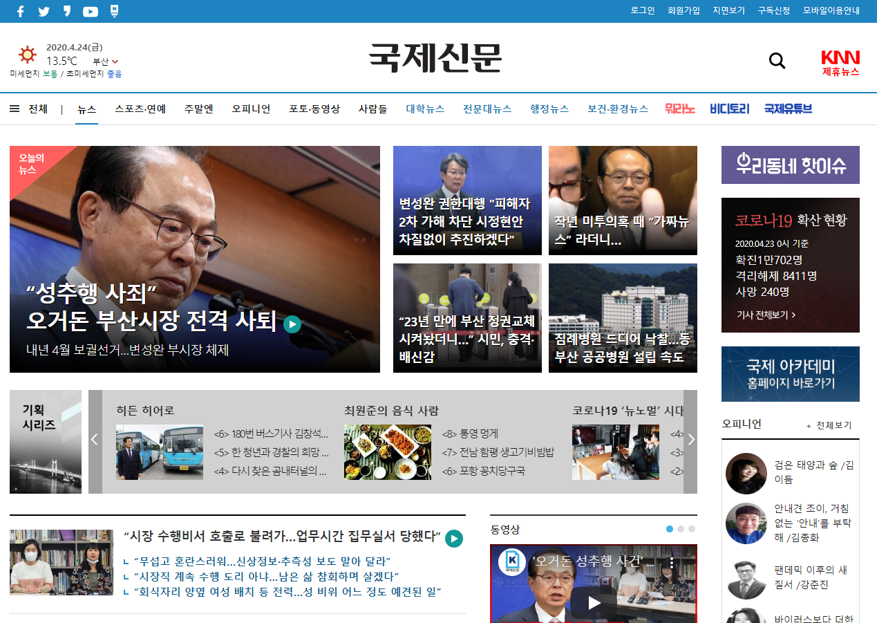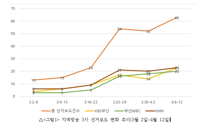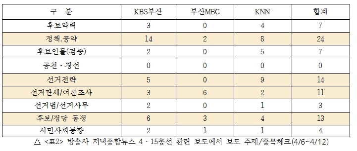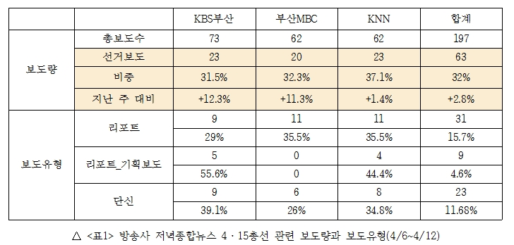 부산2020총선미디어감시연대지부는 부산지역 신문(국제신문, 부산일보)과 지상파방송 메인뉴스(KBS부산, 부산MBC, KNN 저녁종합뉴스)를 주 대상으로 선거보도 모니터링을 진행하고 있습니다. 다음은 지역방송 3사 저녁종합뉴스를 대상으로 4월 6일(월) ~ 4월 12일(일)까지 진행한 방송보도 모니터 보고서입니다.