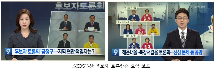 KBS부산은 4월 2일 국회의원 후보자 법정 토론회를 주관해 방송했고, KBS부산 뉴스9에서는 토론방송을 요약해서 보도했다. 후보자 토론방송은 후보의 정책과 자질을 평가할 수 있는 기회인데, 여건상 토론을 보지 못하는 유권자도 있기 때문에 뉴스에서 토론에서 나온 쟁점 공약 등을 요약 보도한 것은 유용했다. 예를 들면 4월 6일 <후보자 토론회 ‘금정구’…지역 현안 적임자는?>에서 침례병원 공공화 방안과 금샘로 부산대 구간 개통에 대한 후보들의 정책을 전하는 것을 시작으로 타 지역구 토론방송 결과도 보도했다.