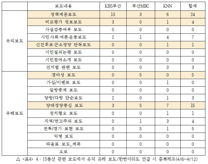 유익한 보도는 정책제공 보도가 24건, 시민‧사회‧여론‧운동 보도가 7건, 비교평가·정보보도가 4건 이었다. 유해 보도는 거대 양당 중심보도가 15건, 전투·경기보도가 5건, 지역·연고주의보도가 3건, 경마성 보도가 5건으로 나타났다.