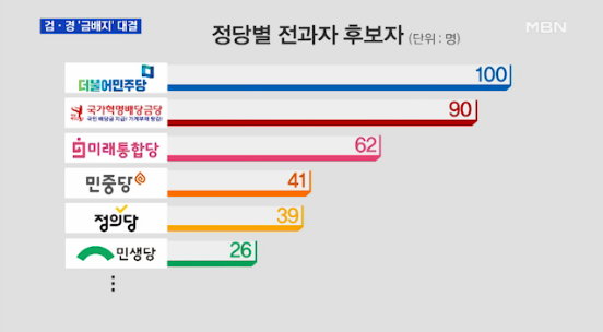 거대 양당 중심 보도 행태는 여전했다. 더불어민주당은 언급 42건, 영상노출 41건이었고, 미래통합당은 언급 40건, 영상노출 40건 이었다. 두 당을 합치면 언급과 영상노출이 60%가 넘는다. 다음은 정의당 언급, 영상노출 20건, 19건, 민생당은 9건, 10건 순이었다.