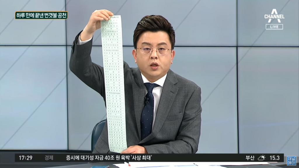 그런데 부산MBC는 다음 날인 4월 7일 <정정보도>를 통해 이의용 후보의 50조 예산 공약은 건강보험이 아닌 기본재난소득 예산이었다고 정정했다. 현재 4월 6일 <32명이 ‘229조’짜리 공약…조달 방안은 ‘허술’> 보도는 부산MBC 홈페이지에서 볼 수 없다.